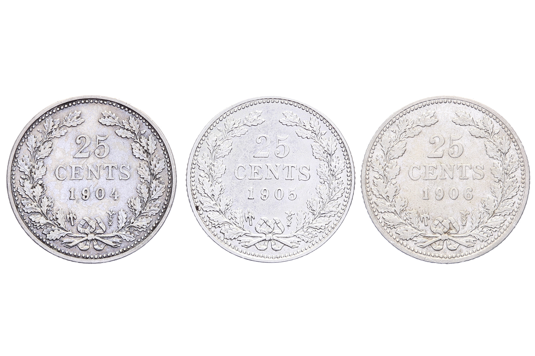 Lot (3) 25 Cents 1904, 1905 en 1906 LSch. 748-750; Sch. 857-859 Vrijwel zeer fraai