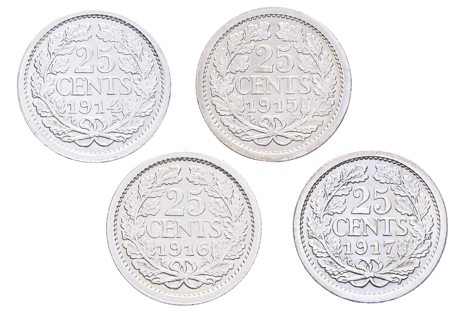 Lot (4) 25 Cents 1914, 1915, 1916 en 1917 LSch. 755-758; Sch. 864-867 Zeer fraai / Prachtig