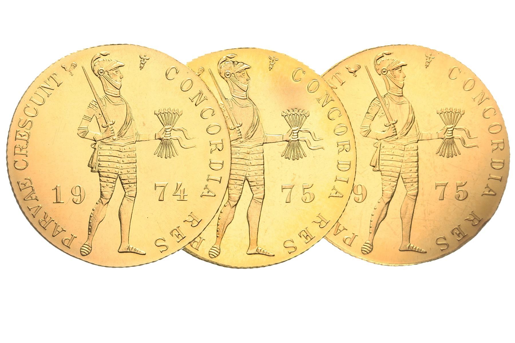 Lot (3) dukaat 1974, 1975(2). LSch. 947, 948; Sch. 1080, 1081. FDC.