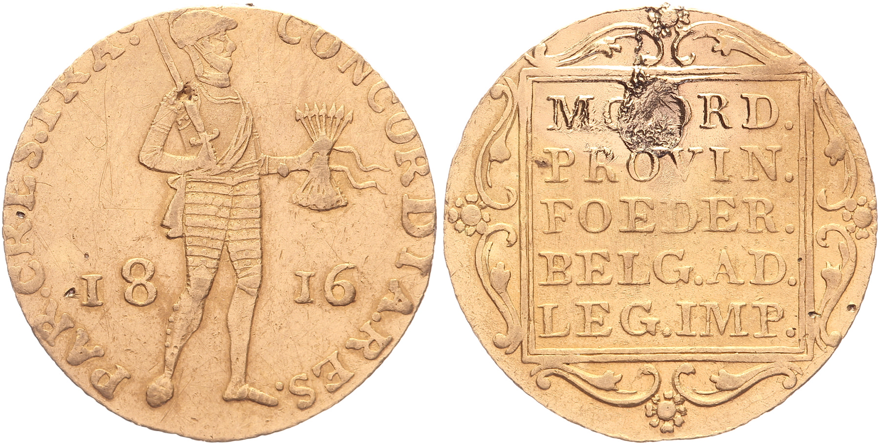 Dukaat 1816 Utrecht LSch. 218; Sch. 203. Montage op wapenschild. Zeer fraai