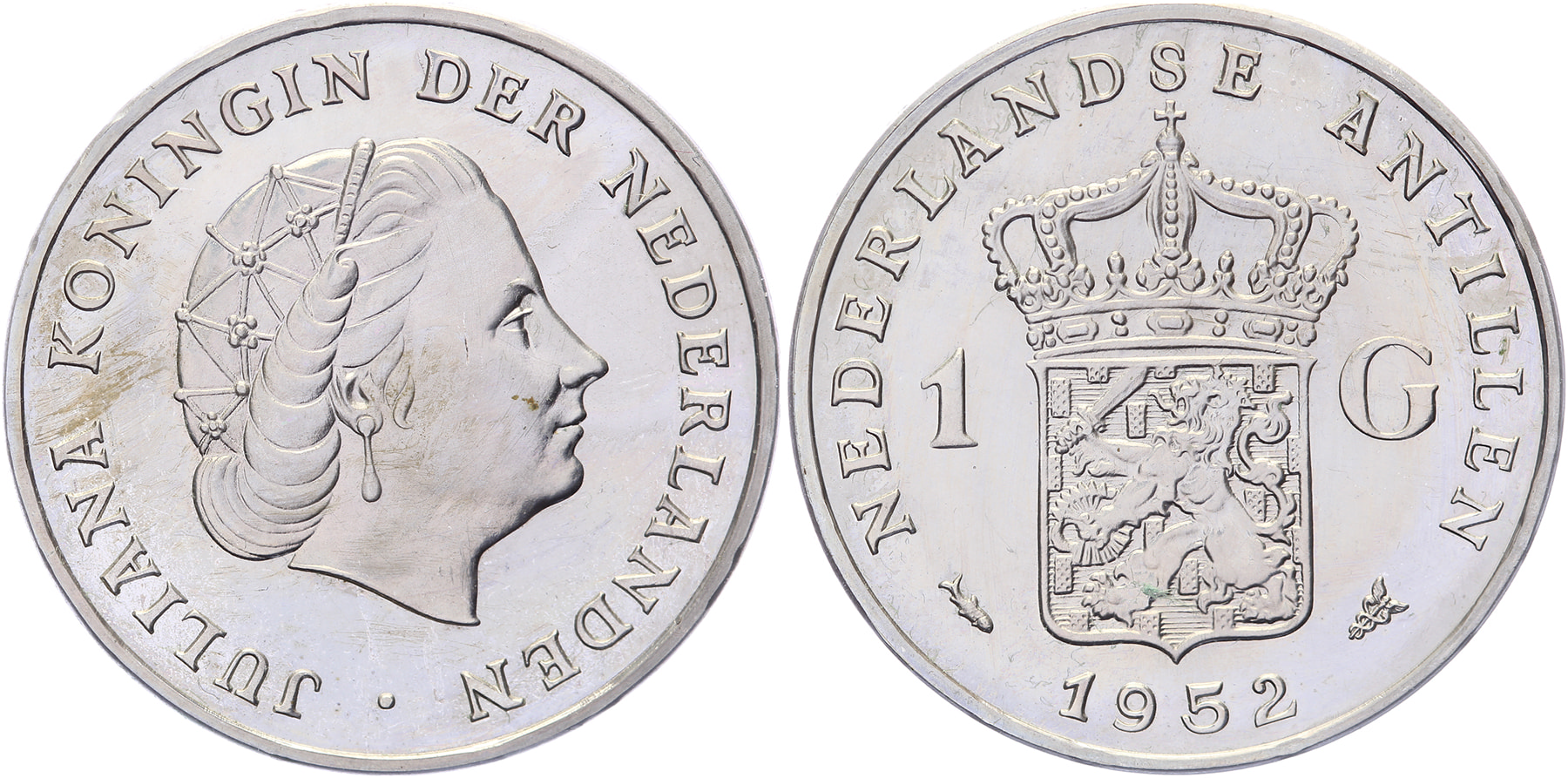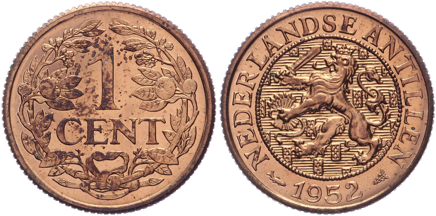 Lot (2) 1 Cent en 1 Gulden 1952 mmt. vis. Sch. 1430 en 1375. Met strip. Proof.
