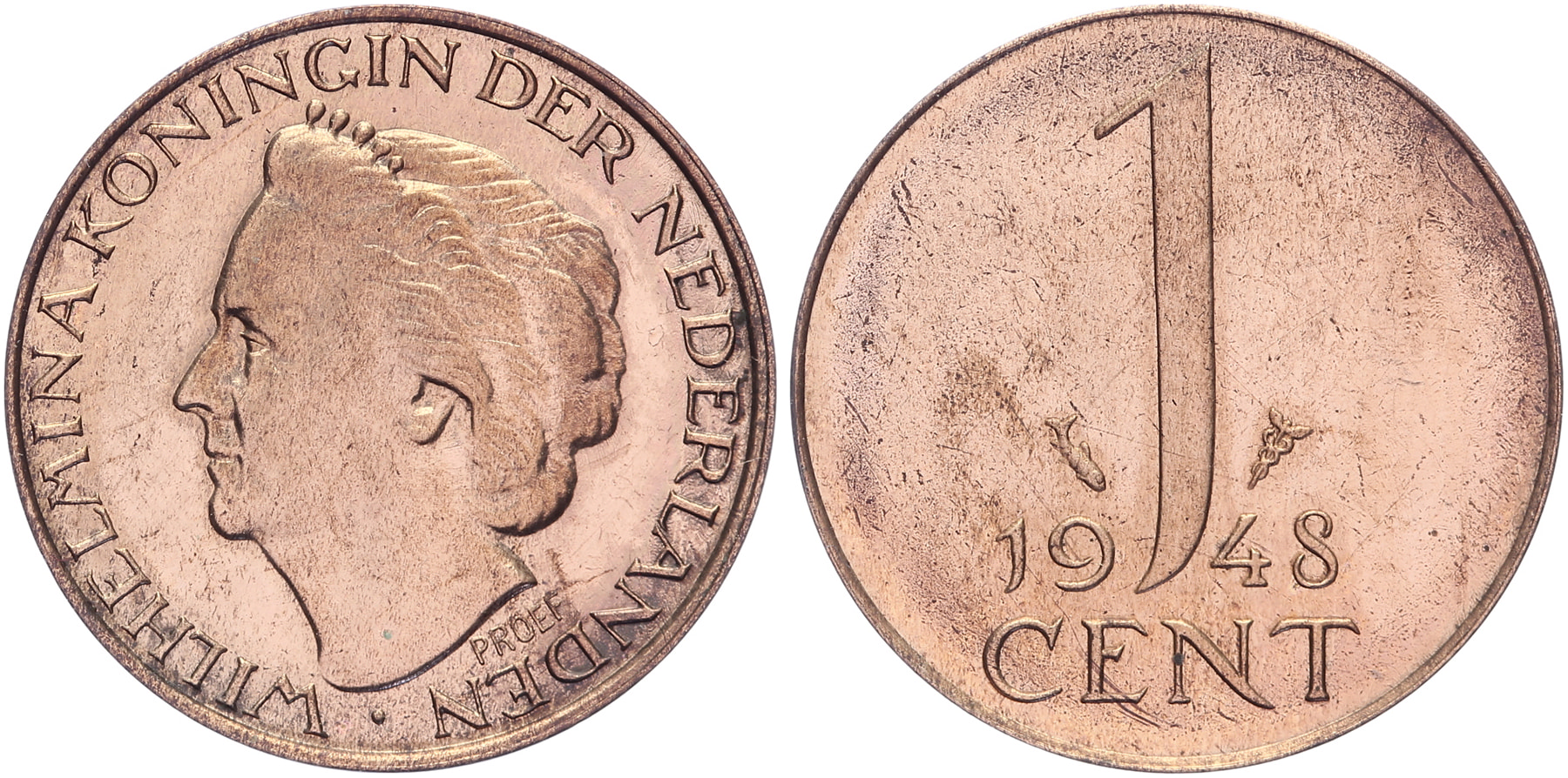 1 Cent 1948 mmt. vis LSch. 916a; Sch. 1077a. Zeldzaam. Proef in halsafsnede. Proof