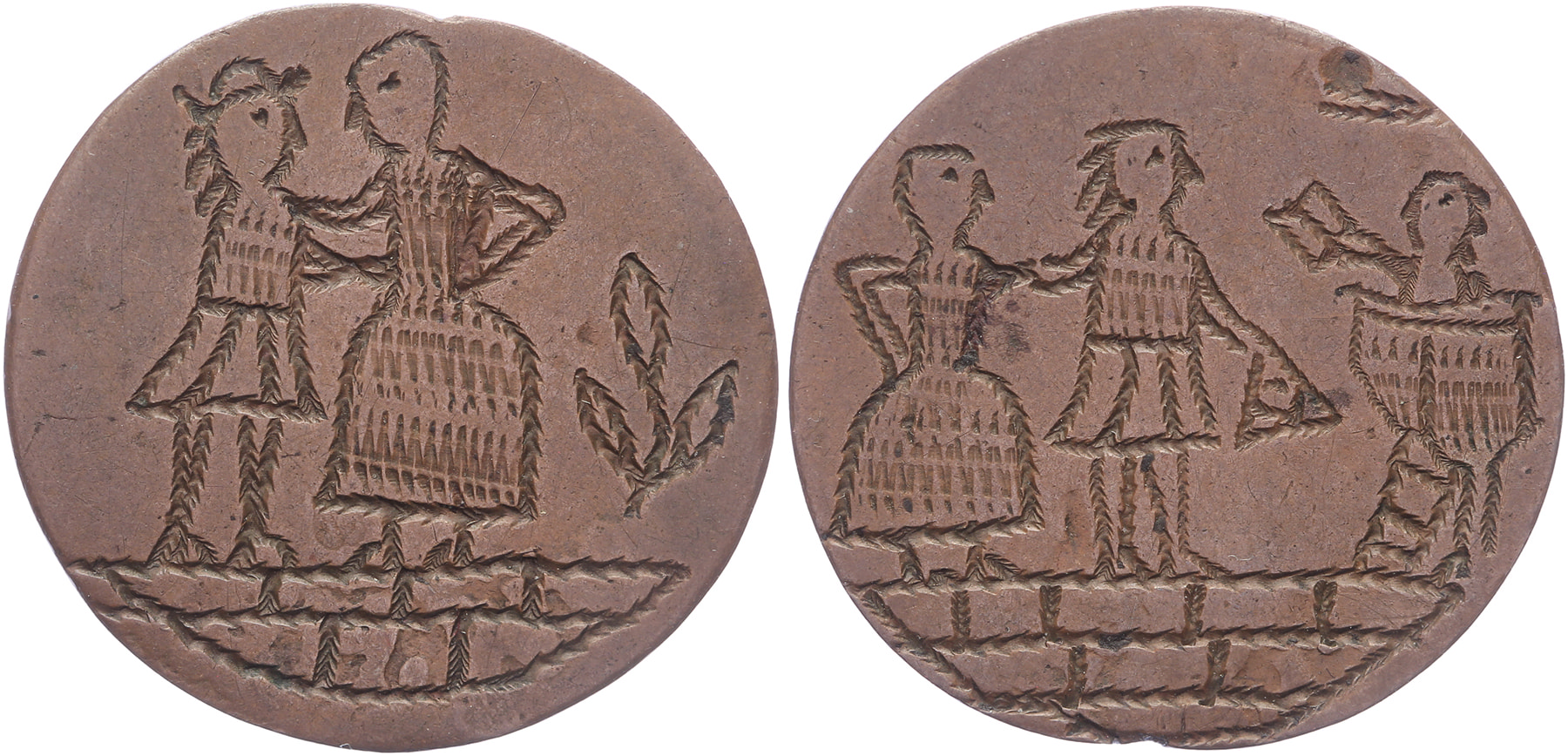 Duit z.j. en geen provincienaam. Geheel gegraveerd met staand meisje in klederdracht bij staande jongeman. / Dezelfde jongen en meisje kijken naar een baby in wieg. Æ25. Apart! Zeer fraai.