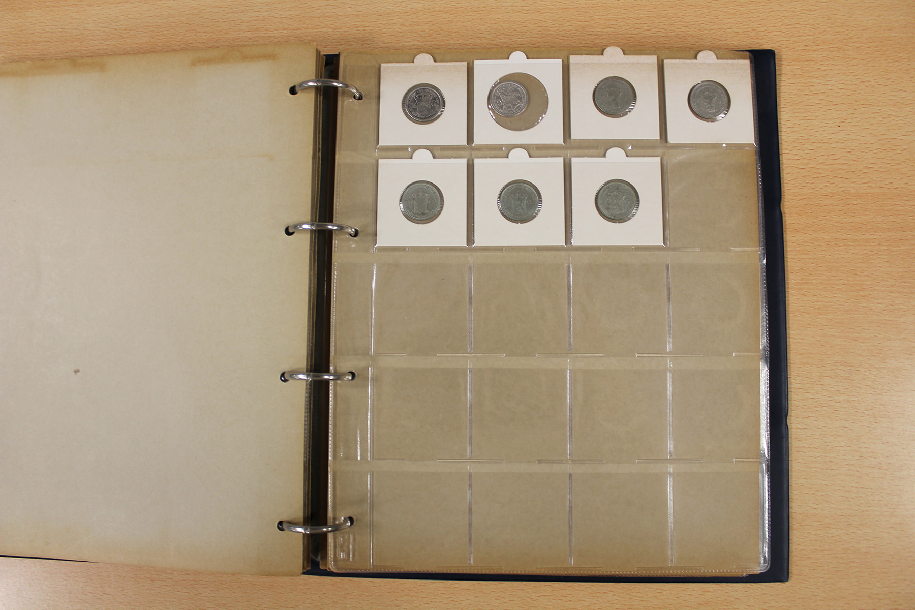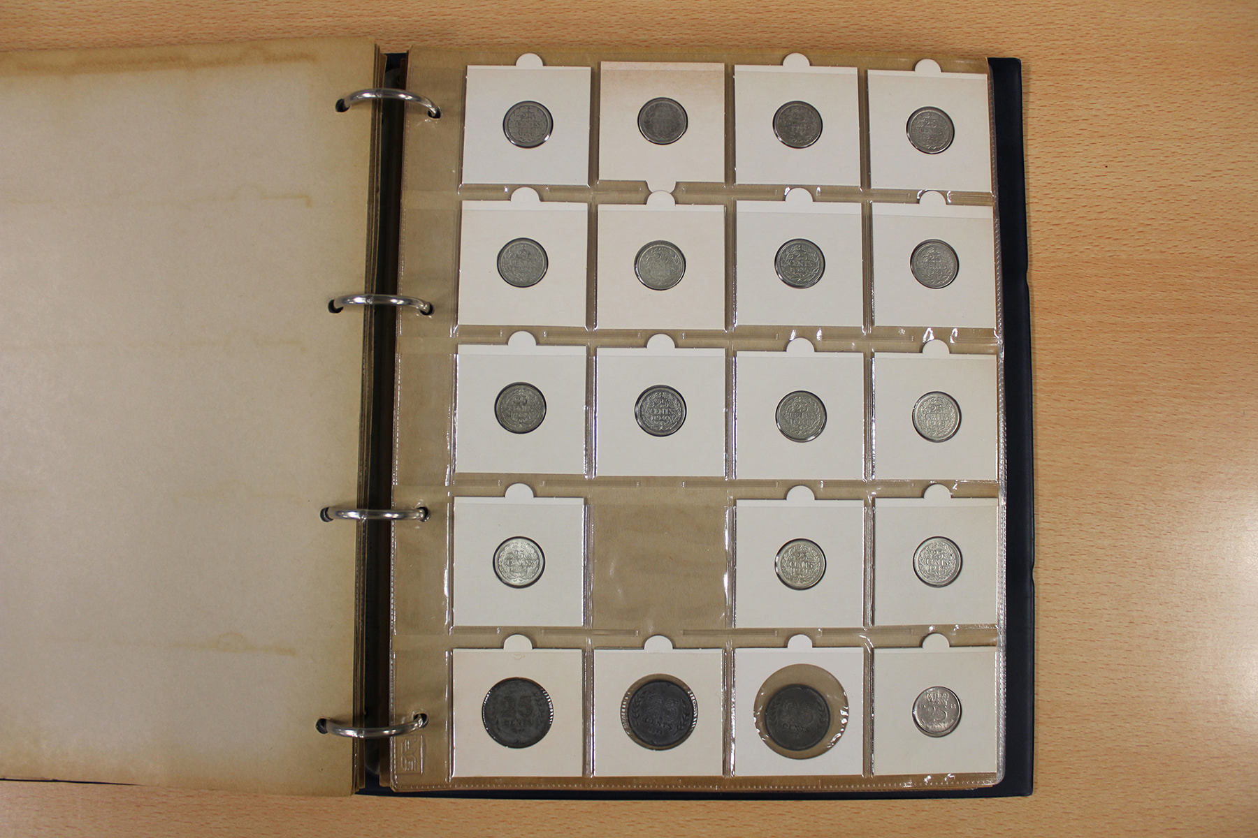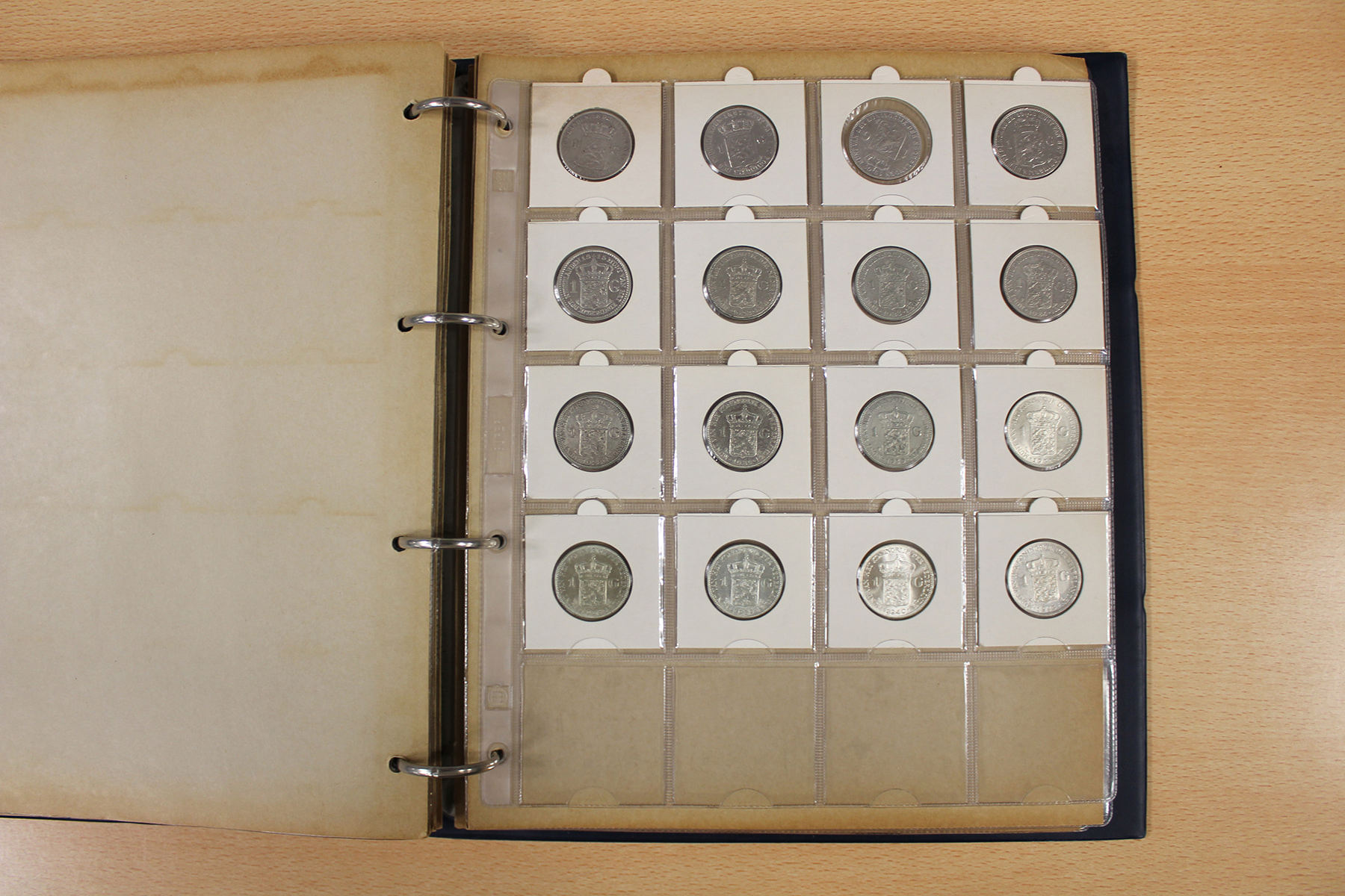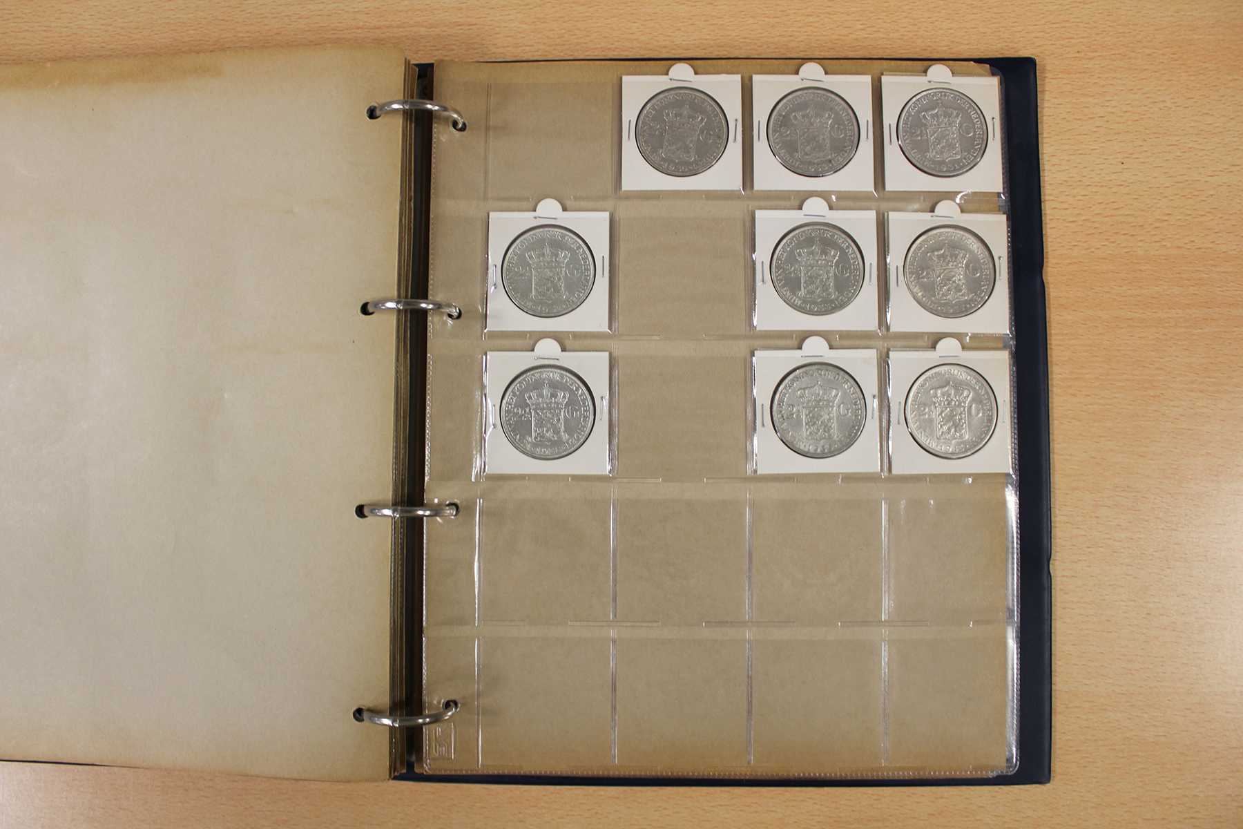 Blauw muntalbum (195) voornamelijk Wilhelmina; van ½ cent t/m rijksdaalder.