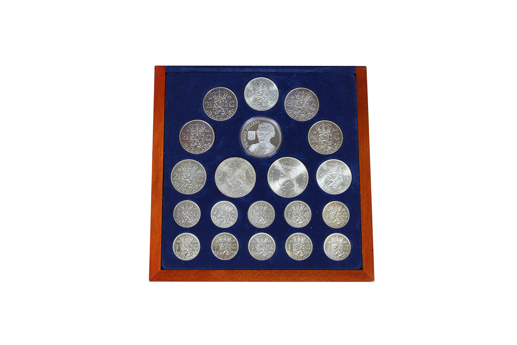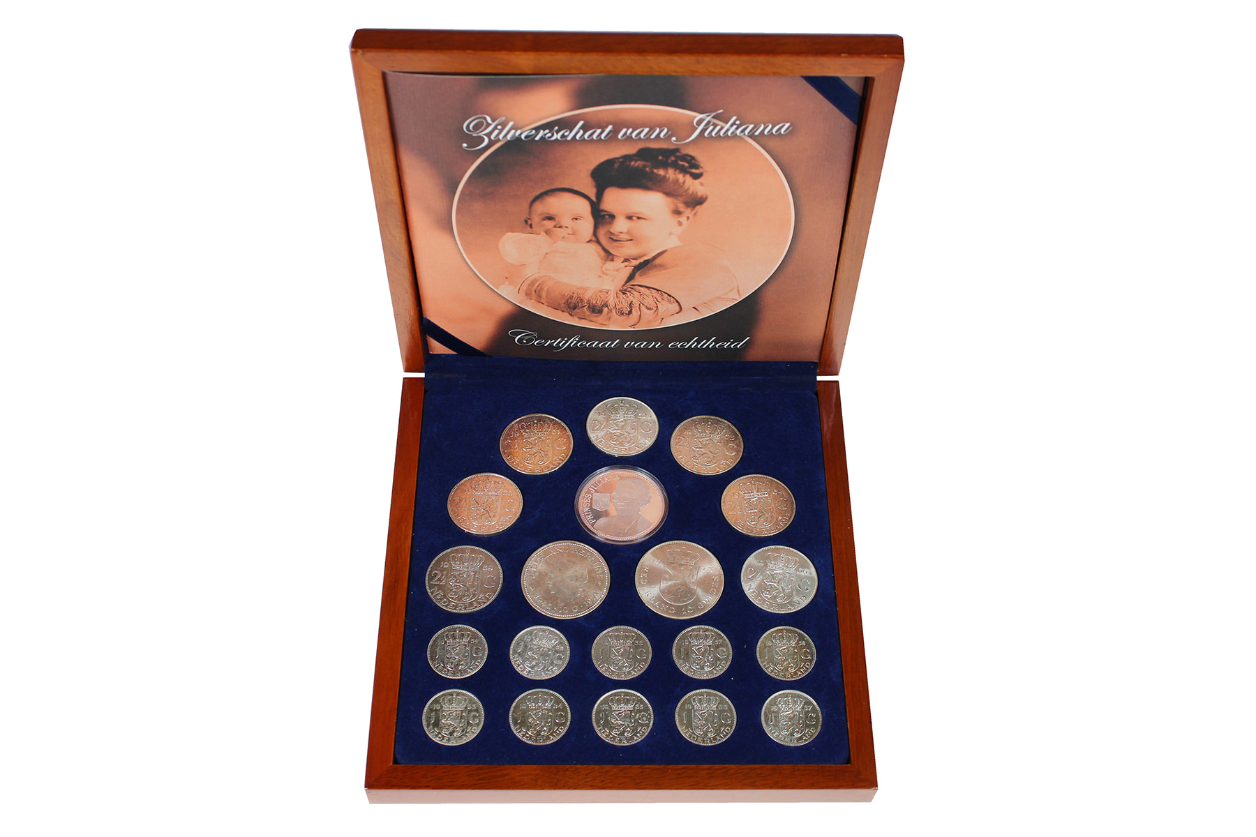 Zilverschat van Juliana. Complete serie zilvergeld guldens, rijksdaalders en zilveren tientjes, met daarbij zilveren penning van Juliana in luxe houten kist.
