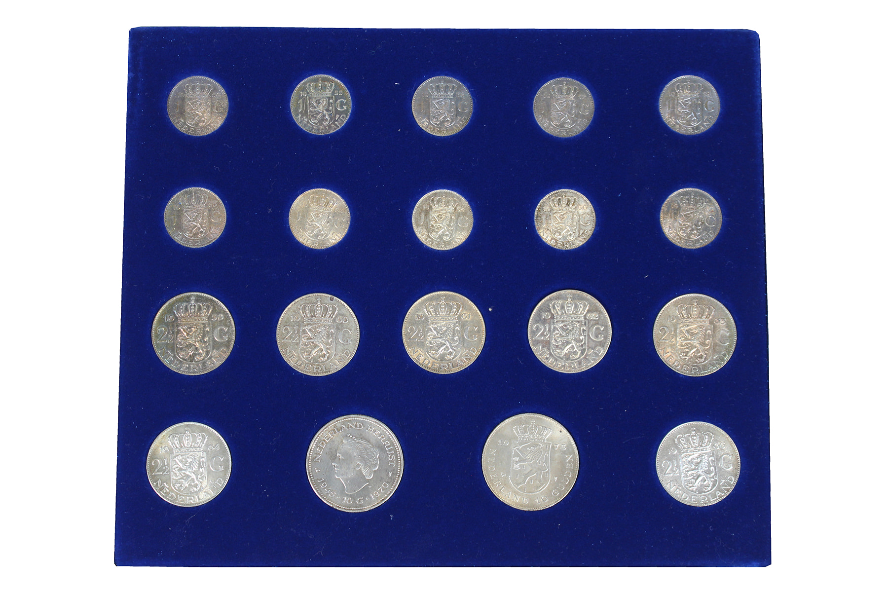 Fraai blauwe cassette “Het Zilvergeld van Juliana” met 2 x 10 Gld.; 7 x riks en 10 x 1 Gld.