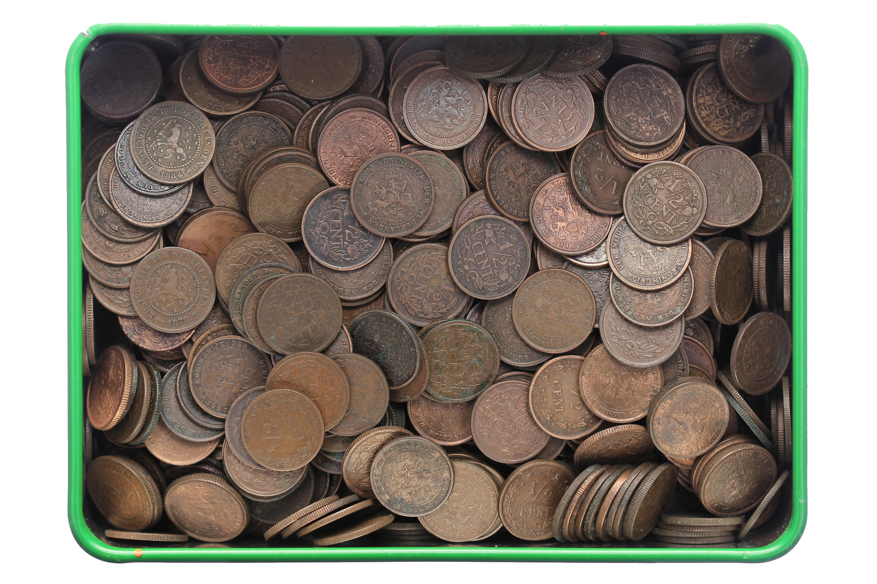 ‘Snoopy’-blikje ½ centen v.h. kleine type 1878-1940 (827x), w.o. 2 x 1883, 1 x 1886 en 4 x 1898.
