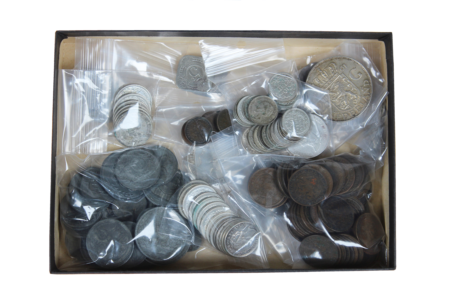 Doosje met wat brons-, zink- en zilvergeld, vnl. Wilhelmina