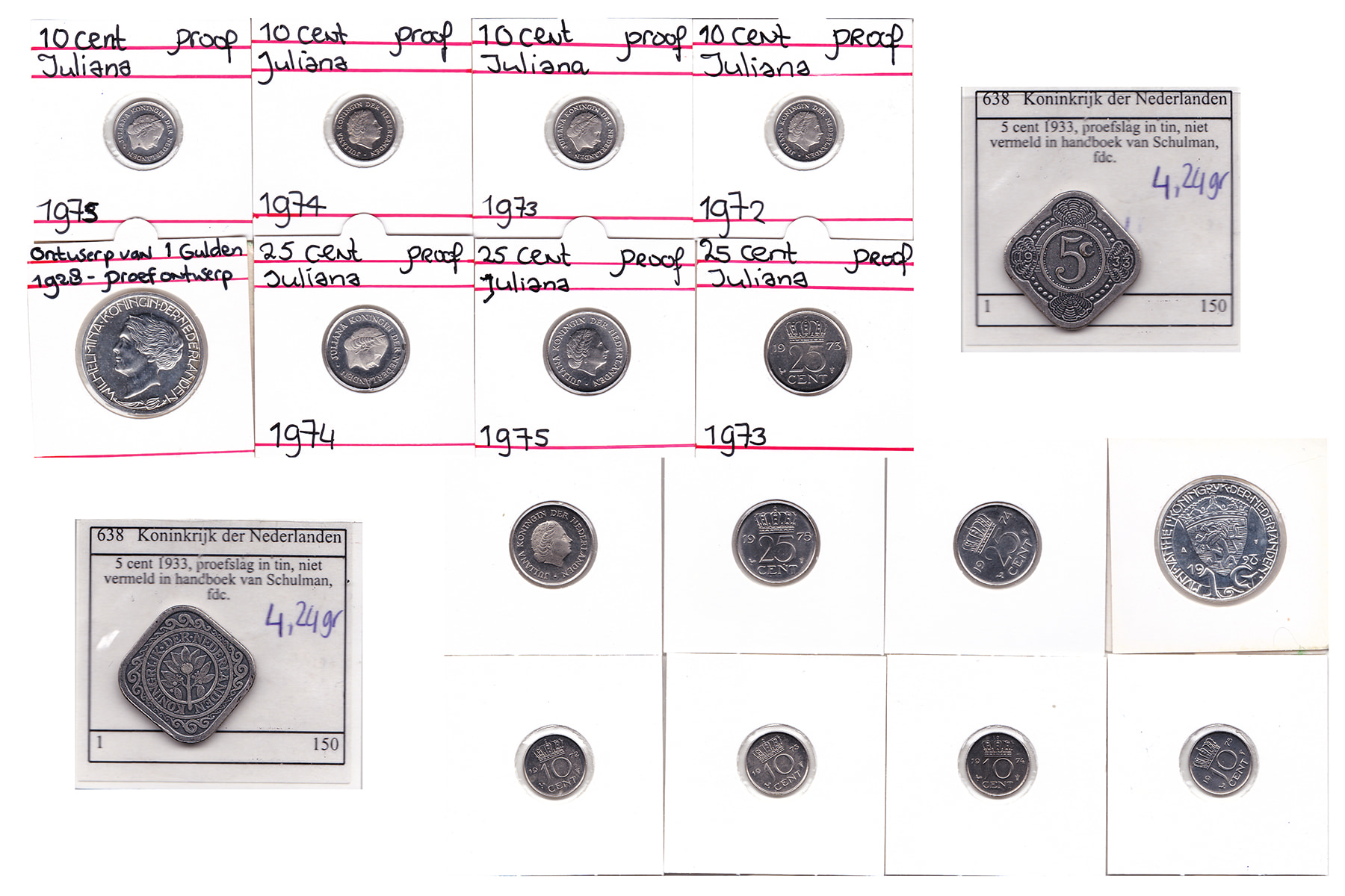 Lot (9) proofmunten van Juliana 10 en 25 cents 1972-1975. Proefontwerp Wilhelmina 1928.Toegevoegd: 5 Cents 1933 tin?