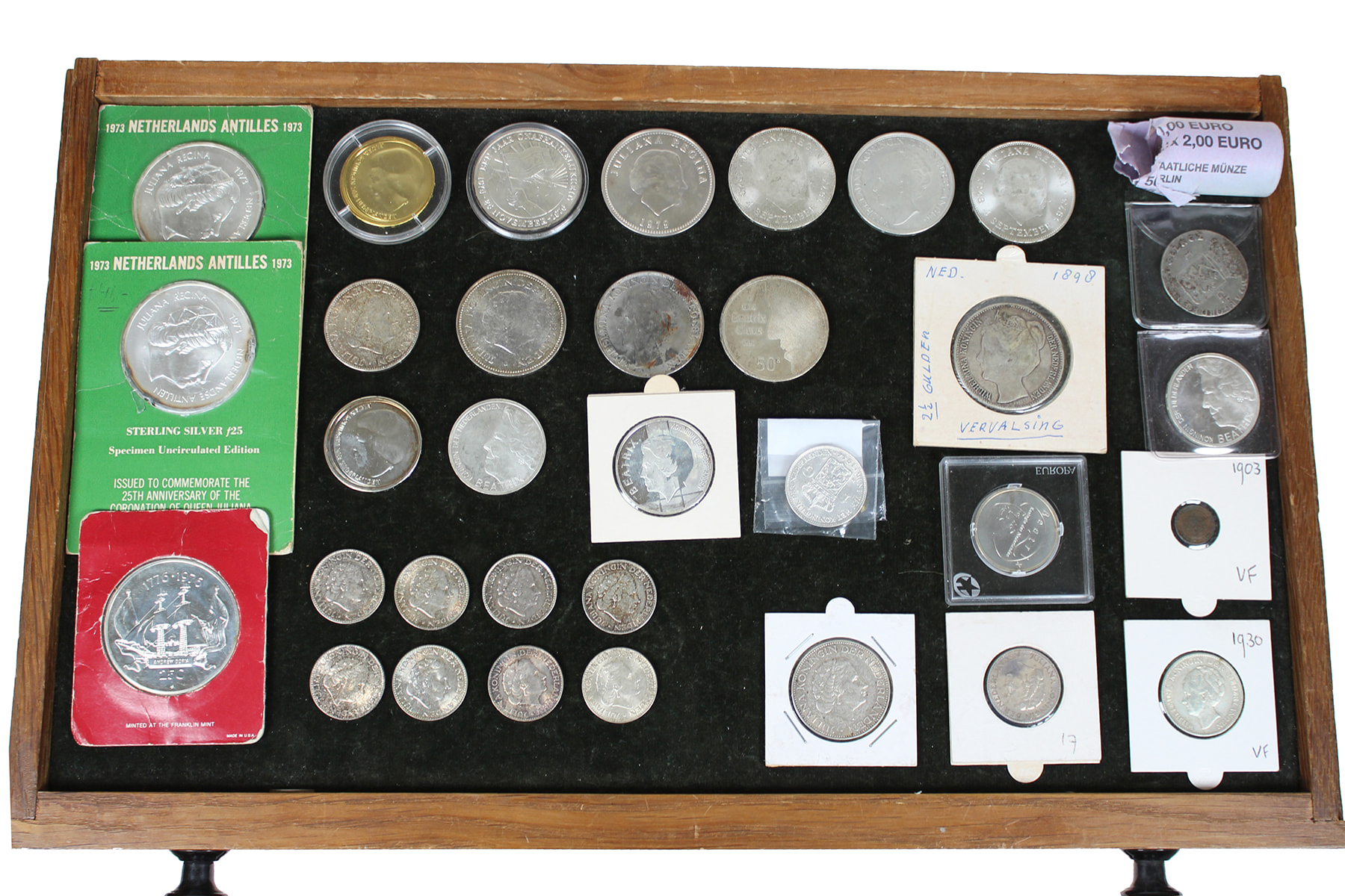 Kunststof bakje met voornamelijk zilveren munten koninkrijk en overzee. Alsmede aangebroken rol met 2 euromunten.