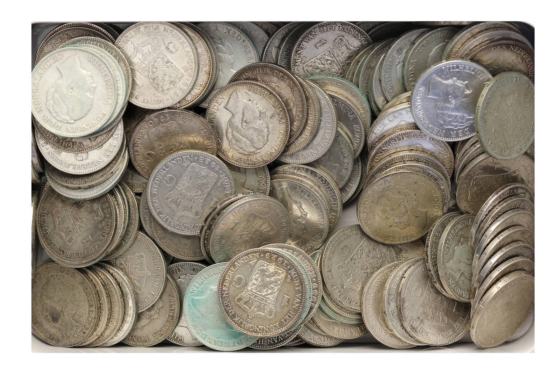 Wit blikje gevuld met zilveren guldens Wilhelmina laatste type (opgestoken haar).Netto zilver: 1171 gram.