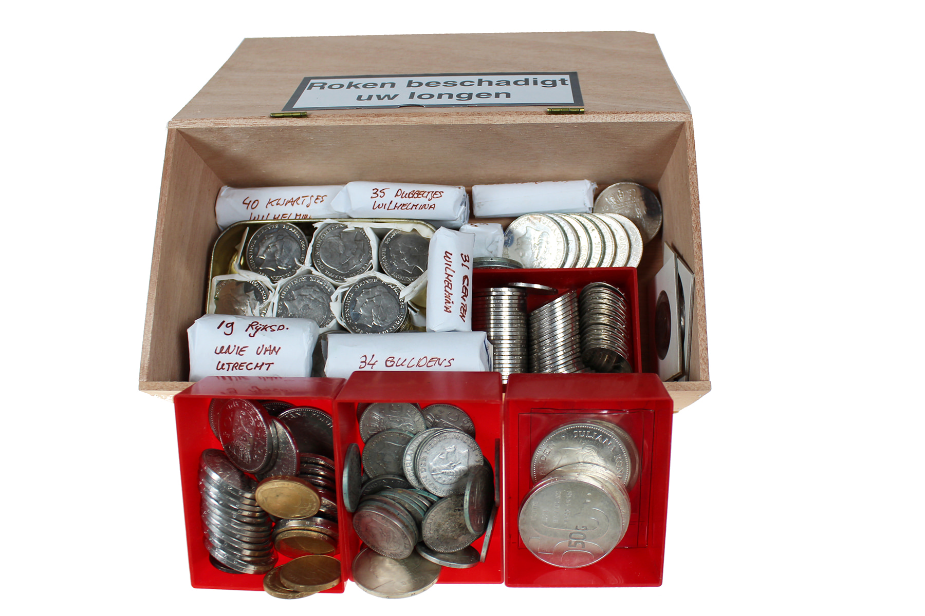 Kistje met oud nominaal uit de guldenperiode. Onder meer dubbeltjes, kwartjes, guldens en rijksdaalders. Daarbij ook zilver! 4 x zilveren tientje, 5 x 50 gulden, 12 x rijksdaalder 1959-1966 en 36 x gulden 1954-1966.