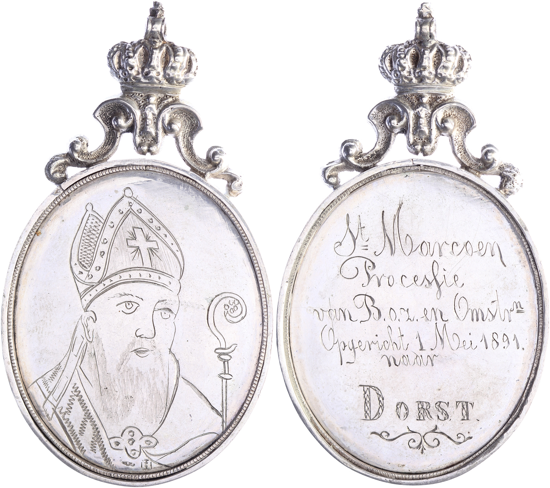 z.j. (±1895) Bergen op Zoom / Dorst, St. Marcoen processie. Borstbeeld St. Marcoen met staf iets naar rechts. / Zesregelig opschrift. AR ovaal 42 x 77 [36,58 gr.] in montuur. Geheel gegraveerd. Prachtig.