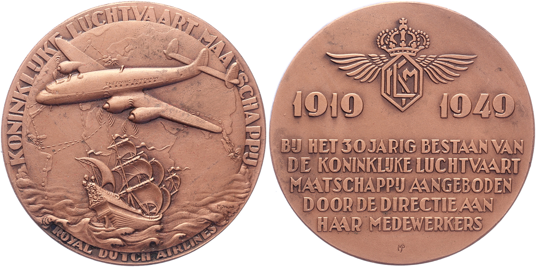 1949 30 jaar Koninklijke Luchtvaart Mij. Vliegtuig + oude driemaster. / Opschrift onder oud logo KLM. Æ 60. Maarten Pauw. In origineel doosje. Prachtig.