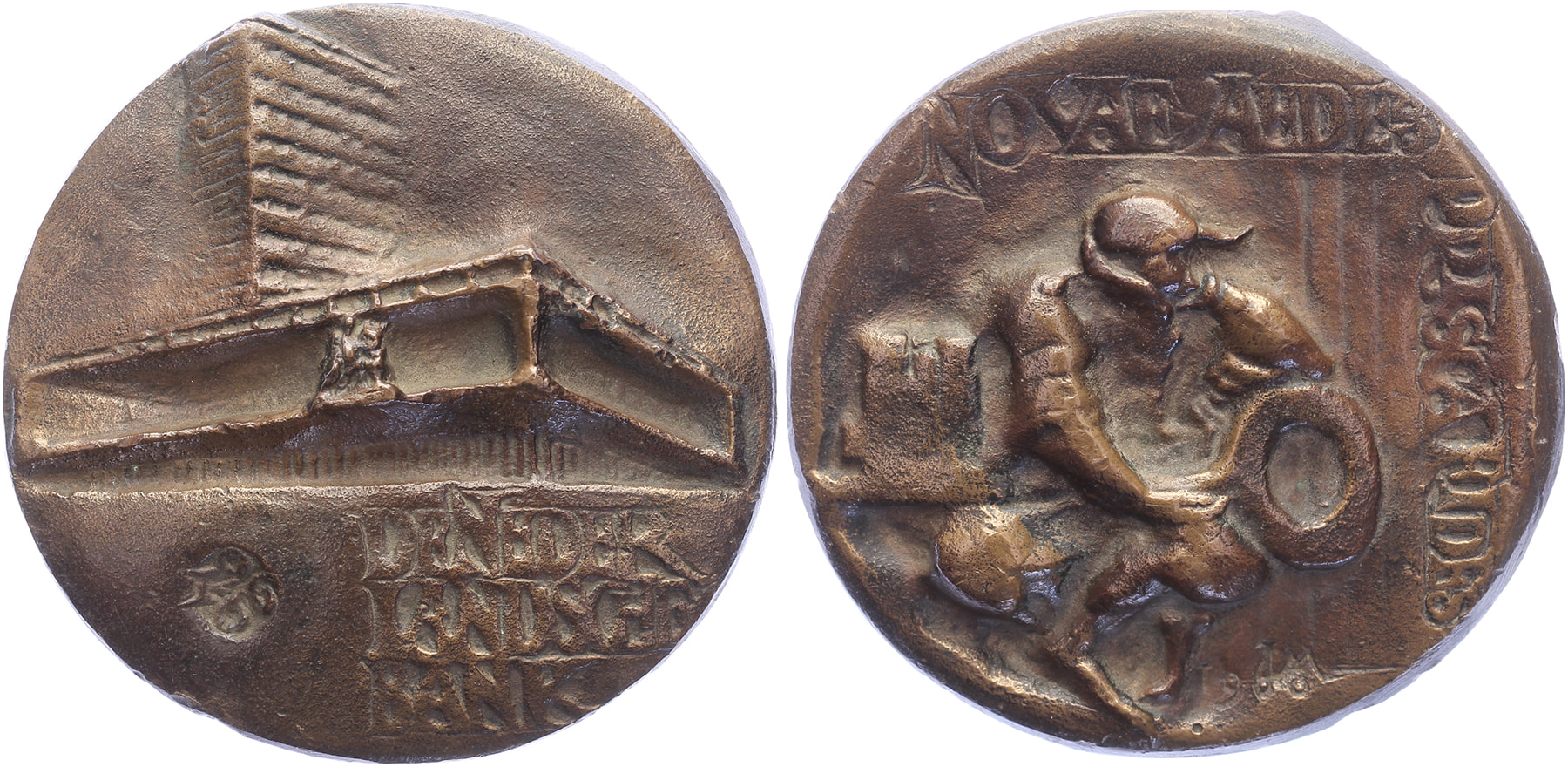 1968 Amsterdam. Opening nieuwbouw De Nederlandsche Bank aan het Frederiksplein. Gezicht op de nieuwbouw. / Man met kluissleutel. Æ gegoten 75. De Beeldenaar 1998, pag. 130, nr. 45. Loeki Metz. Prachtig.