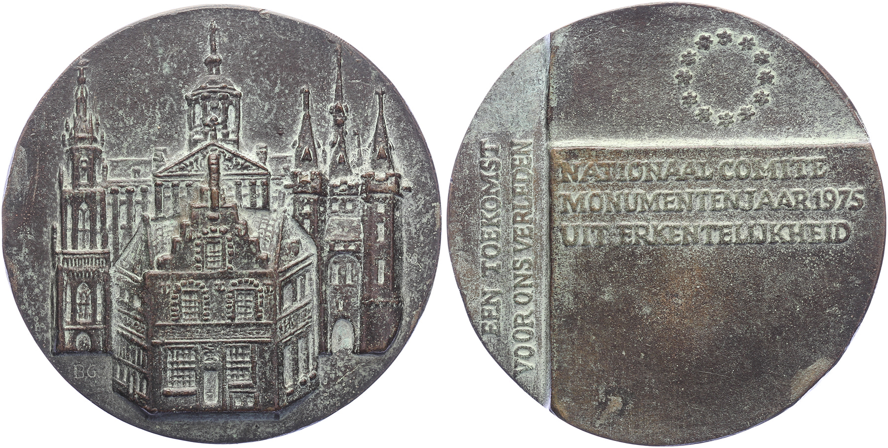 1975 Erepenning Nationaal Comité monumentenjaar. Historische gebouwen uit diverse plaatsen. / Tekst + inscriptieruimte. Æ gegoten 80. Prachtig.