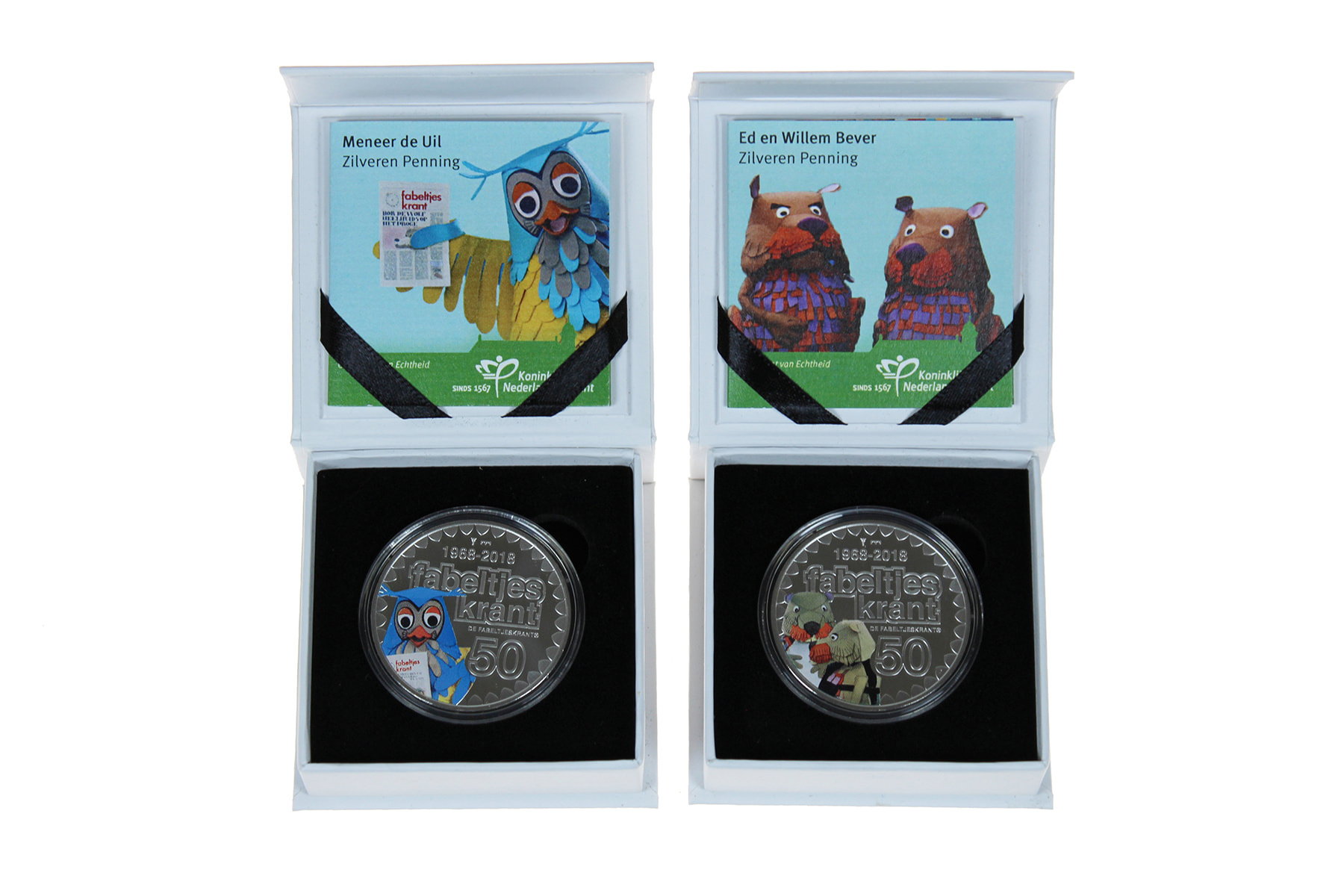 Lot (2) 2018 De Fabeltjeskrant 50 jaar. Twee zilveren penningen met Meneer de Uil en de gebroeders Ed & Willem Bever in kleur. Beide AR 38,6 [31,1 gram, 925/1000]. Nostalgie!