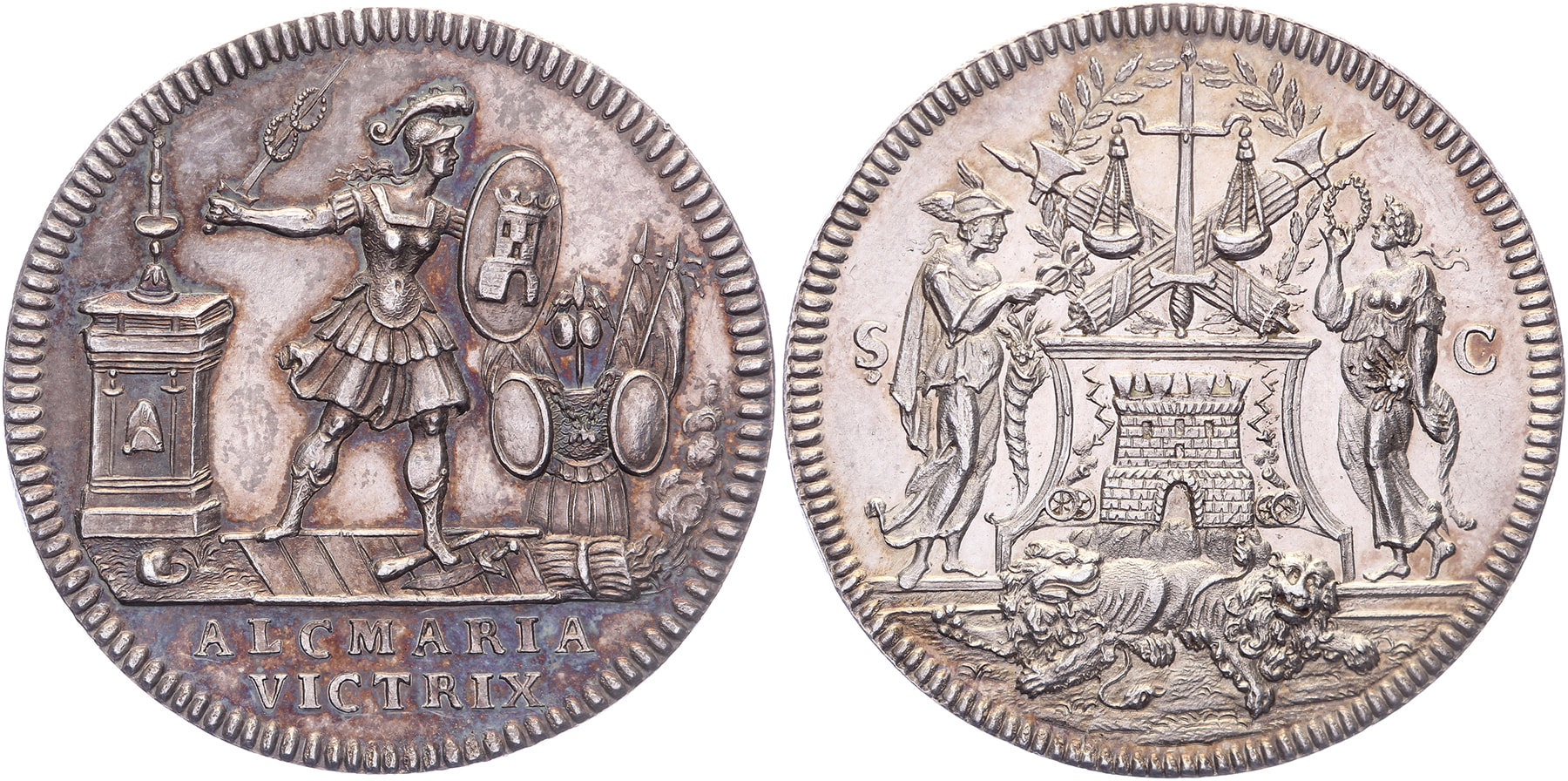 z.j. (1735-1736) Vroedschapspenning. Verdedigende stedemaagd. / Burcht boven liggende leeuwen. AR 33,6 [11,85 gram]. vL I-168; De Vries (JMP 2014) stempelcombinatie EW. (N. van Swinderen). Prachtig.