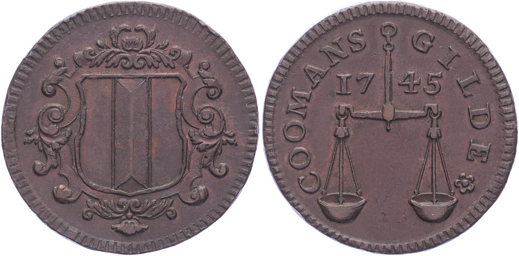 1745 Koopmansgilde. Wapen van Dordrecht. / Weegschaal met jaartal. Æ 28. WK 3.1; Dirks XXXVII.2; Minard 164. Prachtig.