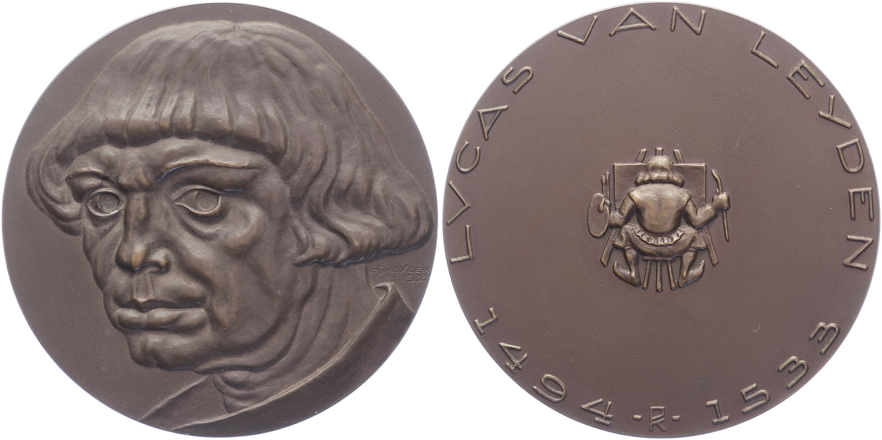 1933 Lucas van Leyden, schilder. Hoofd iets naar links. / Lucas, op z’n rug gezien, aan het werk.Æ 60. Tilanus p. 99-101. Gerrit Jan van der Veen. Prachtig.