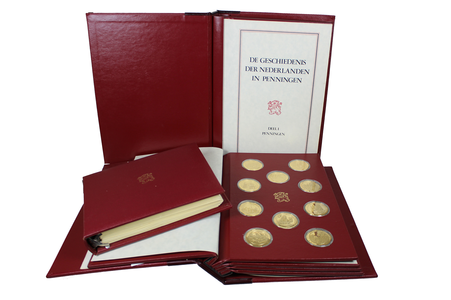 Collectie van 100 stuks sterling zilveren penningen m.b.t. De Geschiedenis der Nederlanden in twee luxe opbergbanden. Geslagen met gepolijste stempels en met goud verguld (ca. 2000 gram bruto). Een uitgifte van Franklin Mint.