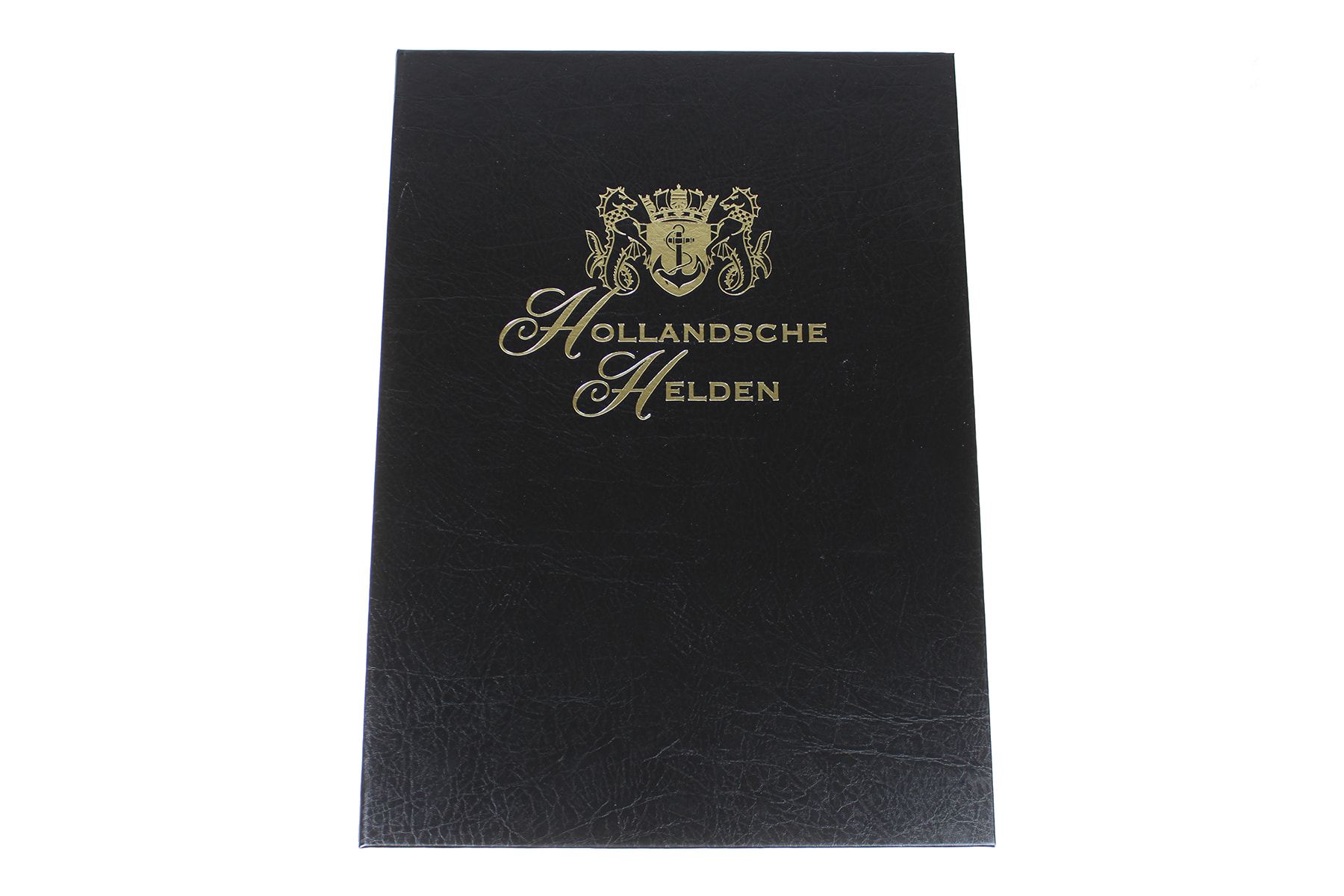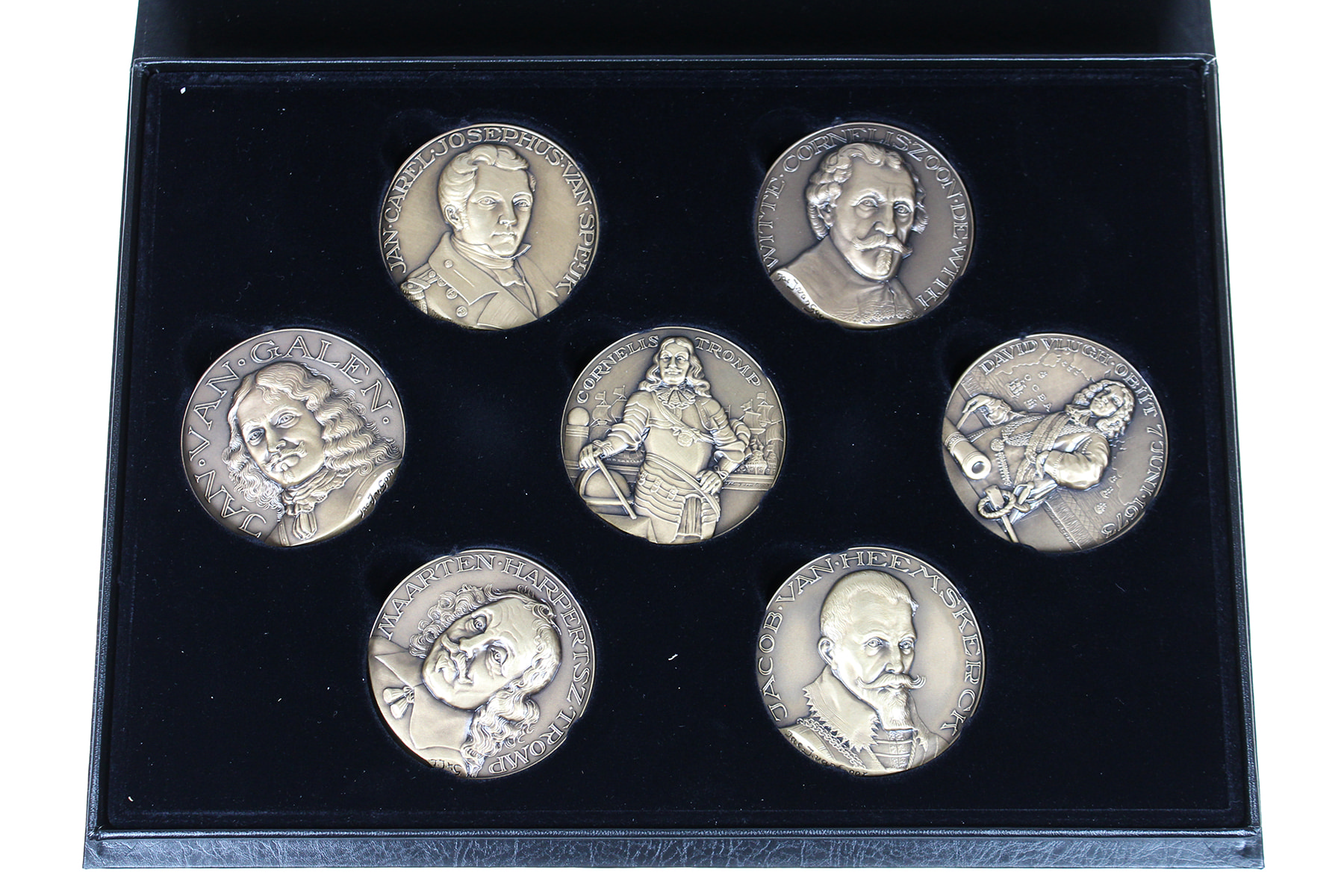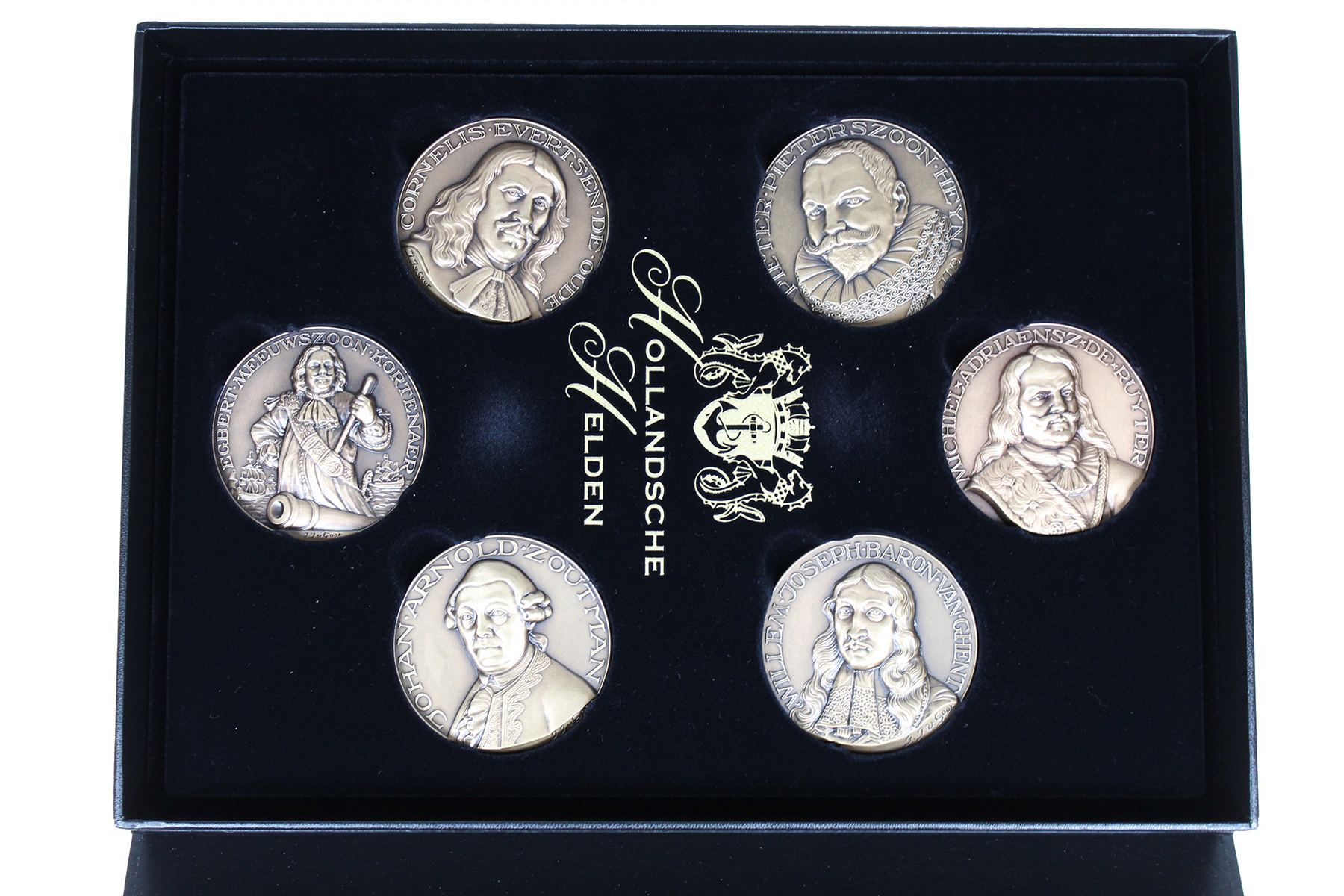 Hollandsche Helden. Luxe zwarte map met prachtige collectie met 13 stuks zwaar bronzen penningen van onze vroegere helden. Mooi voor de liefhebber.