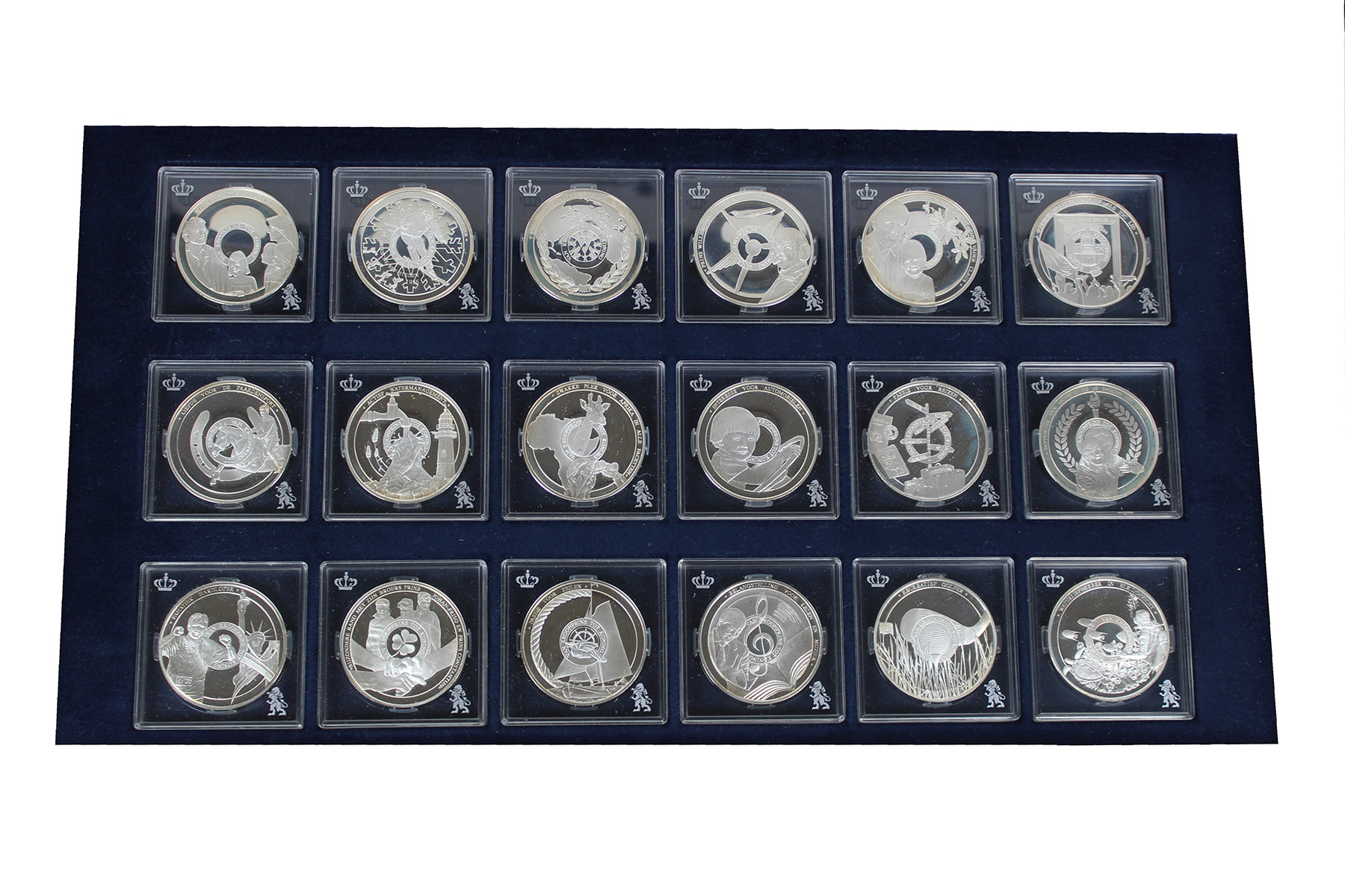 Luxe blauwe cassette met 18 stuks sterling zilveren penningen uit de serie Van Kroonprins tot Koning. Uitgifte van KNM.