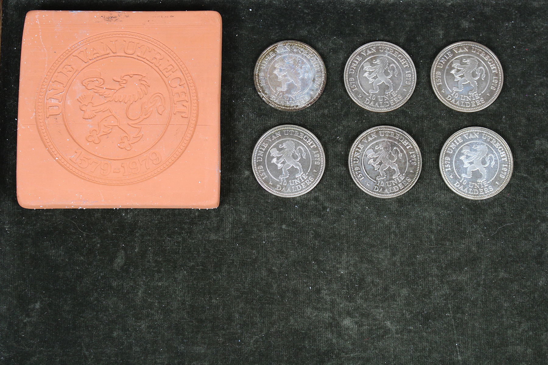 Aardewerk tegeltje “Unie van Utrecht 1579-1979” + 6 x zilveren penning met hetzelfde thema.Netto zilver: 108 gram.