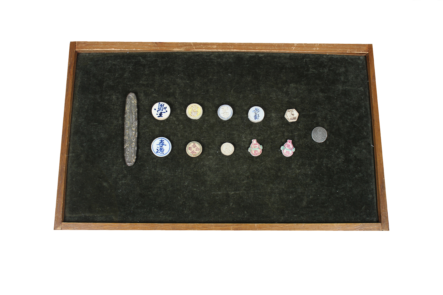 Kistje met porselein theegeld, alsmede een zilveren tijgertong uit Nederlands-Indië (ca. 72 gram).