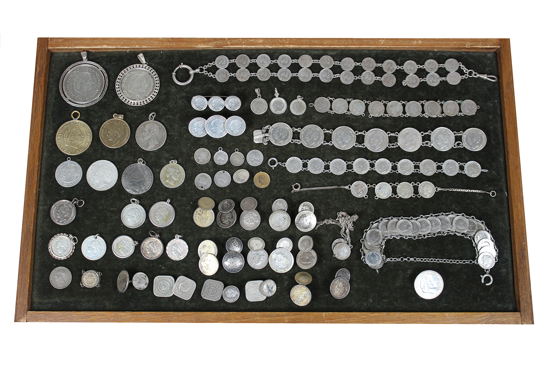 Voor de liefhebber, zwart fluwelen cassette met muntsieraden, veelal huisvlijt. Voornamelijk zilver. Ca. 450 gram.