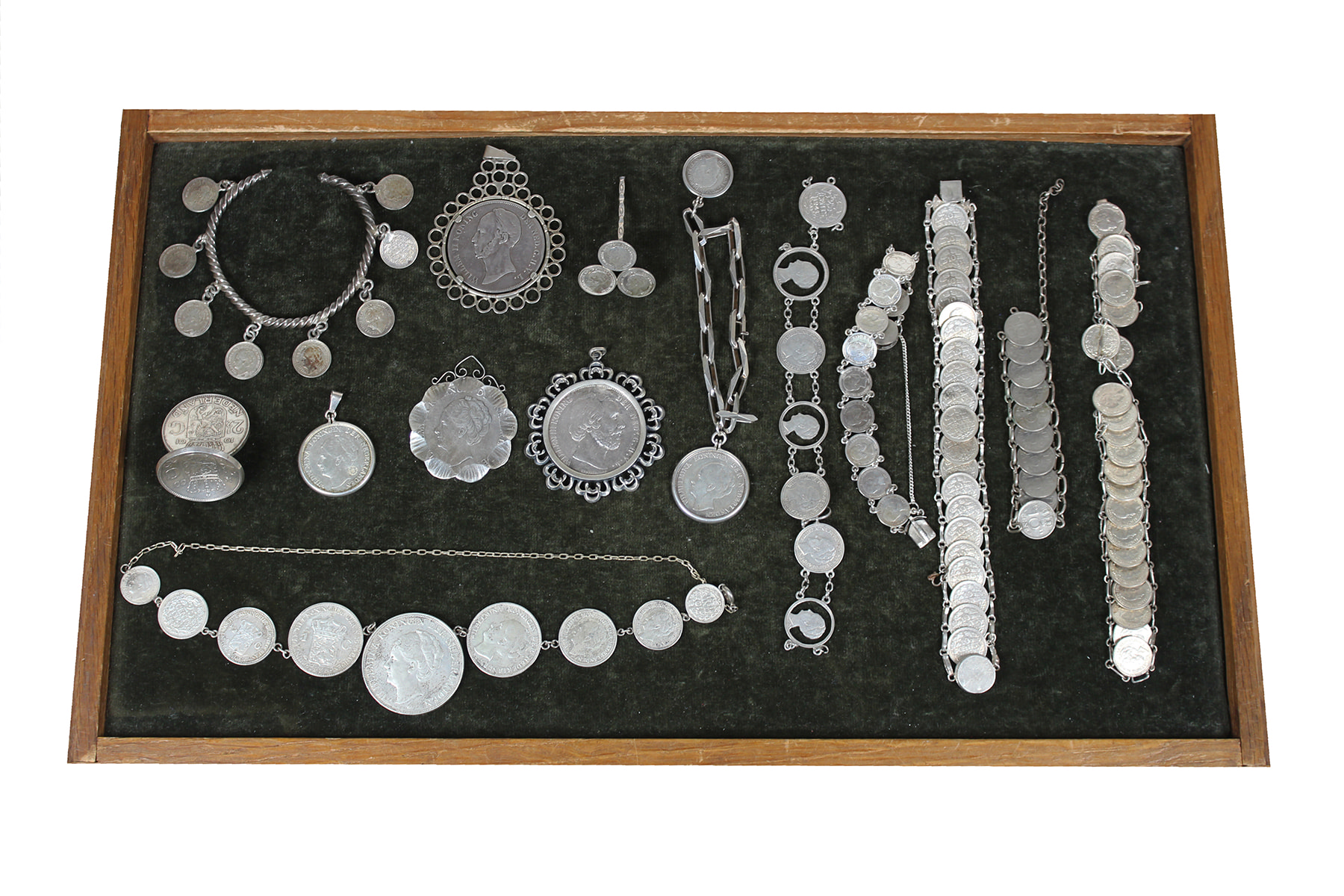 Kunststof bakje met tientallen tot sieraad verminkte munten. Sommige zelfs uiterst aardig! Voornamelijk zilver. Ruim 400 gram bruto.