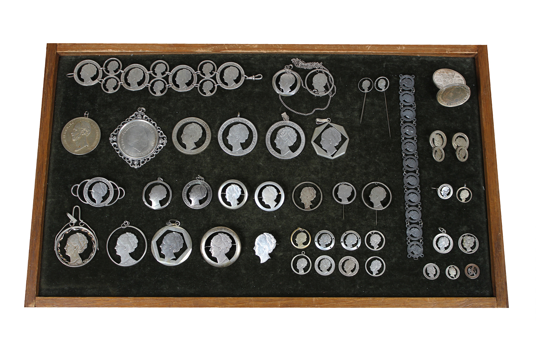 Kunststof bakje met tientallen tot sieraad verminkte munten. Sommige zelfs uiterst aardig! Voornamelijk zilver. Ruim 400 gram bruto.