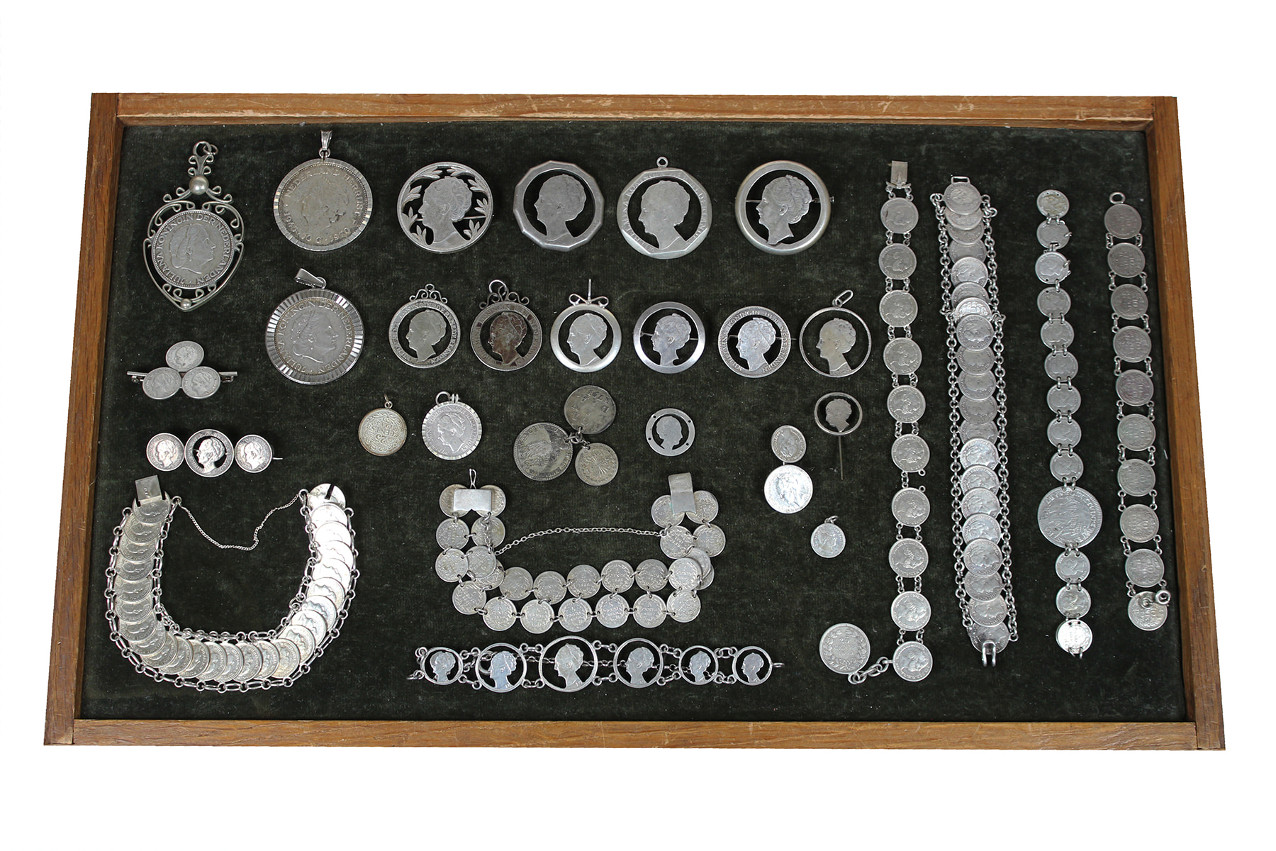 Kunststof bakje met tientallen tot sieraad verminkte munten. Sommige zelfs uiterst aardig! Voornamelijk zilver. Ruim 400 gram bruto.