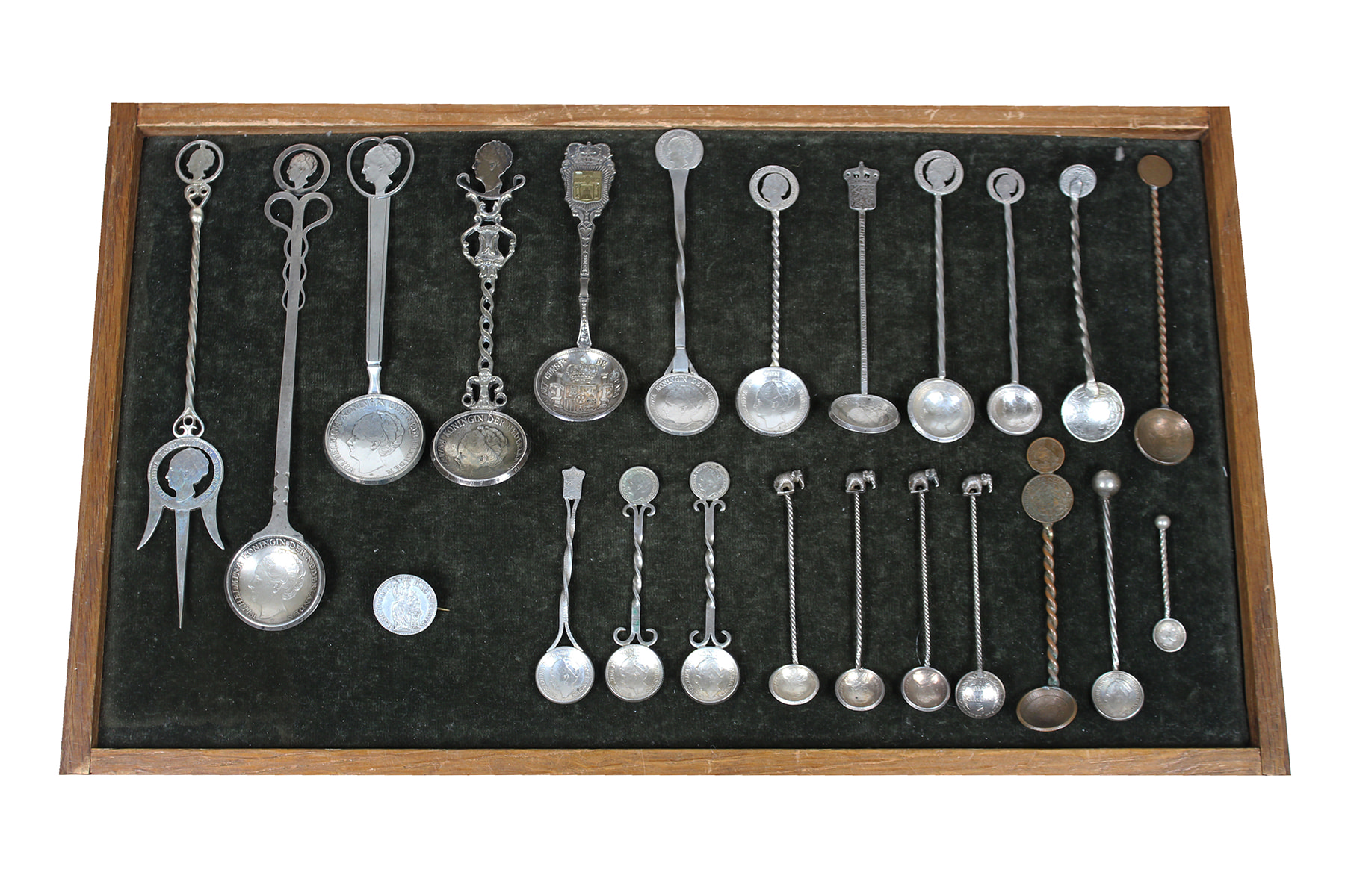 Kistje met uiterst curieuze collectie ‘Numismatisch’ bestek. Eet smakelijk! Ca. 330 gram bruto AR.