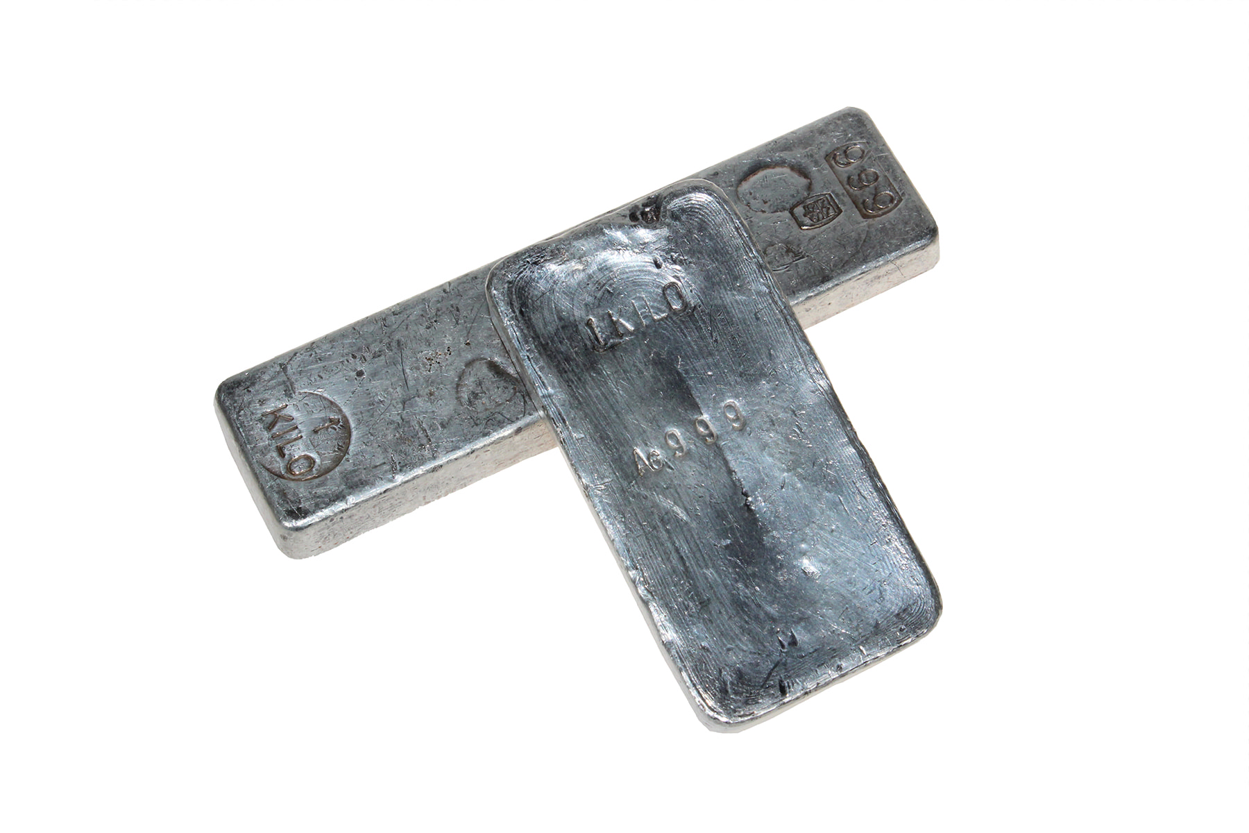 Grijze slof met 2 stuks oude zilverbaren van 1 kg. 999, vermoedelijk voorlopers van Drijfhout??