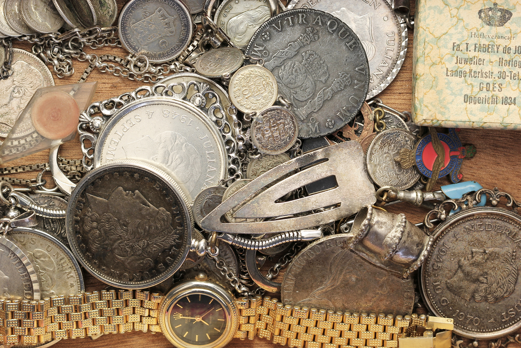 Sigarendoosje met sieraden uit munten gemaakt; hangers, armbanden enz. Ook nog een dameshorloge.