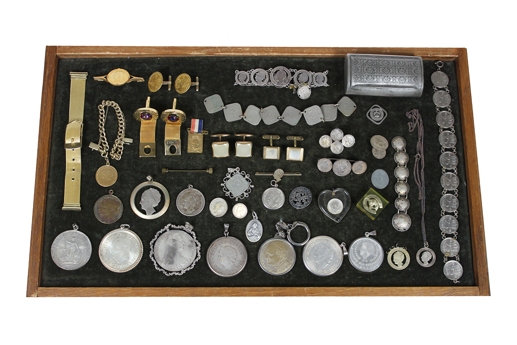 Gestoffeerd ‘juwelendoosje’ met brik en brak, o.a. munten tot sieraad verminckt! Ook goud en zilver.