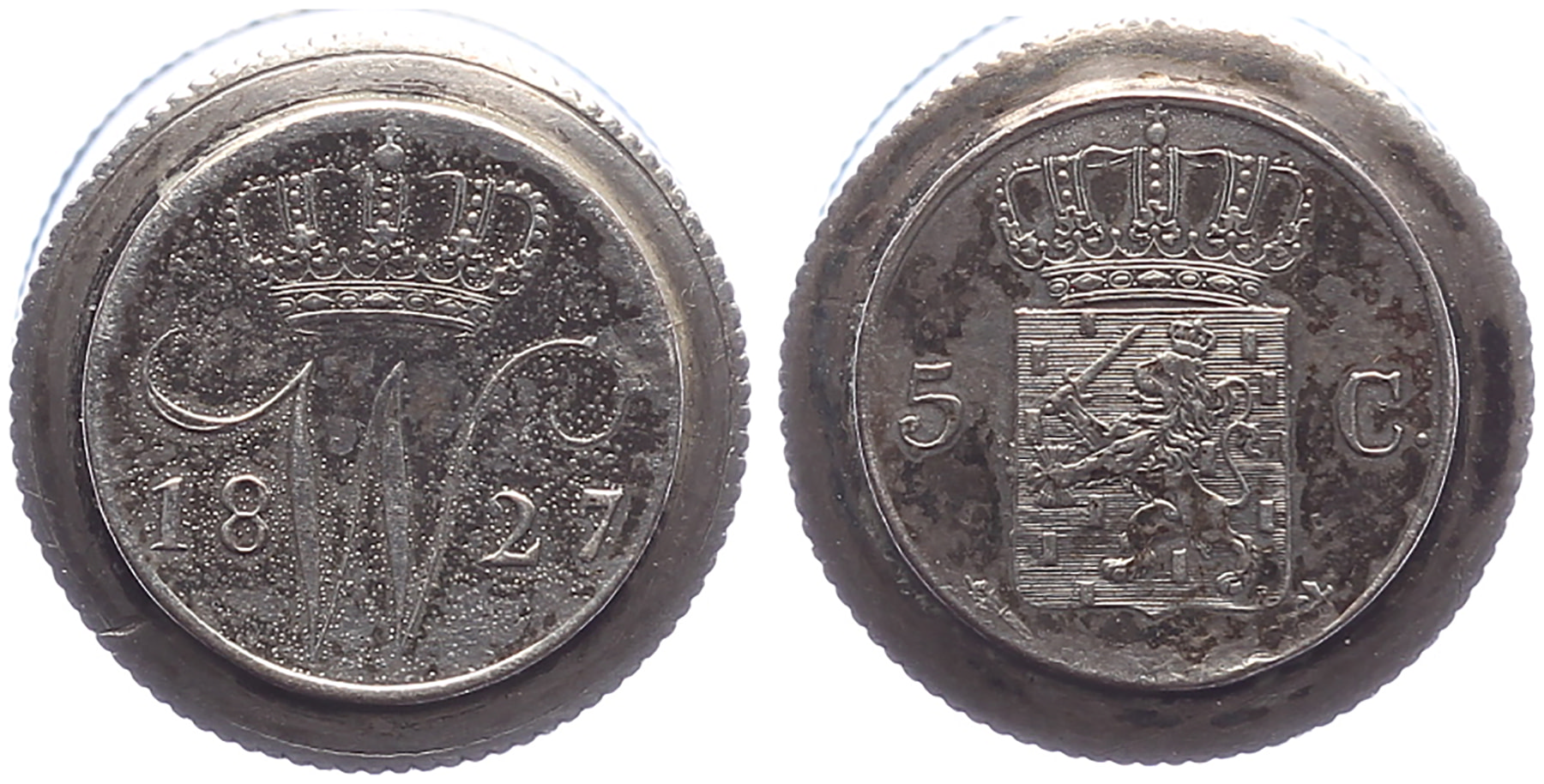 Zilveren muntkokertje gemaakt van 5 cents Willem I 1827 Utrecht. Zeer curieus, zonder inhoud!