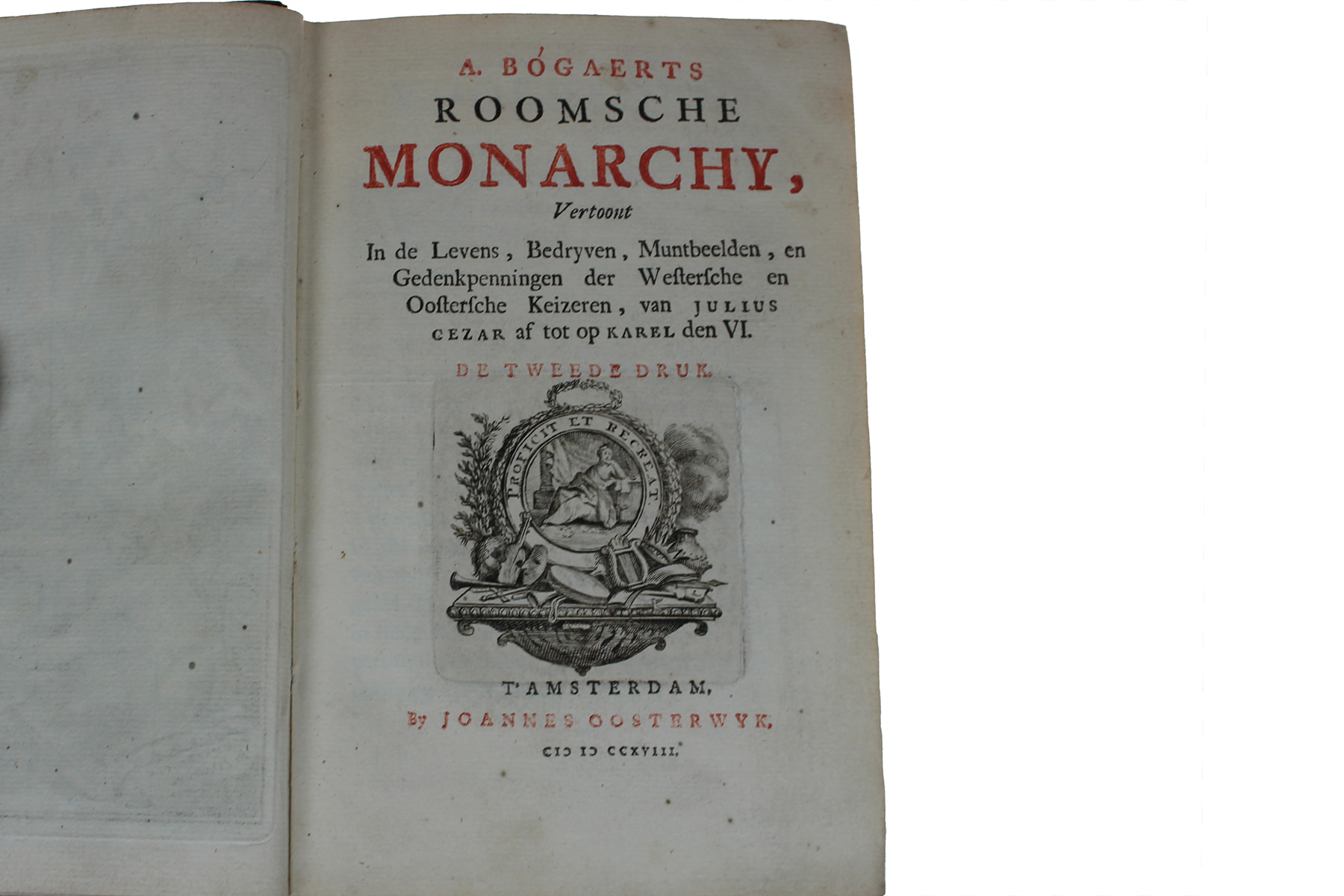 Bogaerts, A. Roomsche Monarchy - In de Levens, Bedryven, Muntbeelden en Gedenkpenningen der Westersche en Oostersche Keizeren, van Julius Cesar af tot op Karel de VI. Amsterdam 1718, 2e druk. Goede staat.