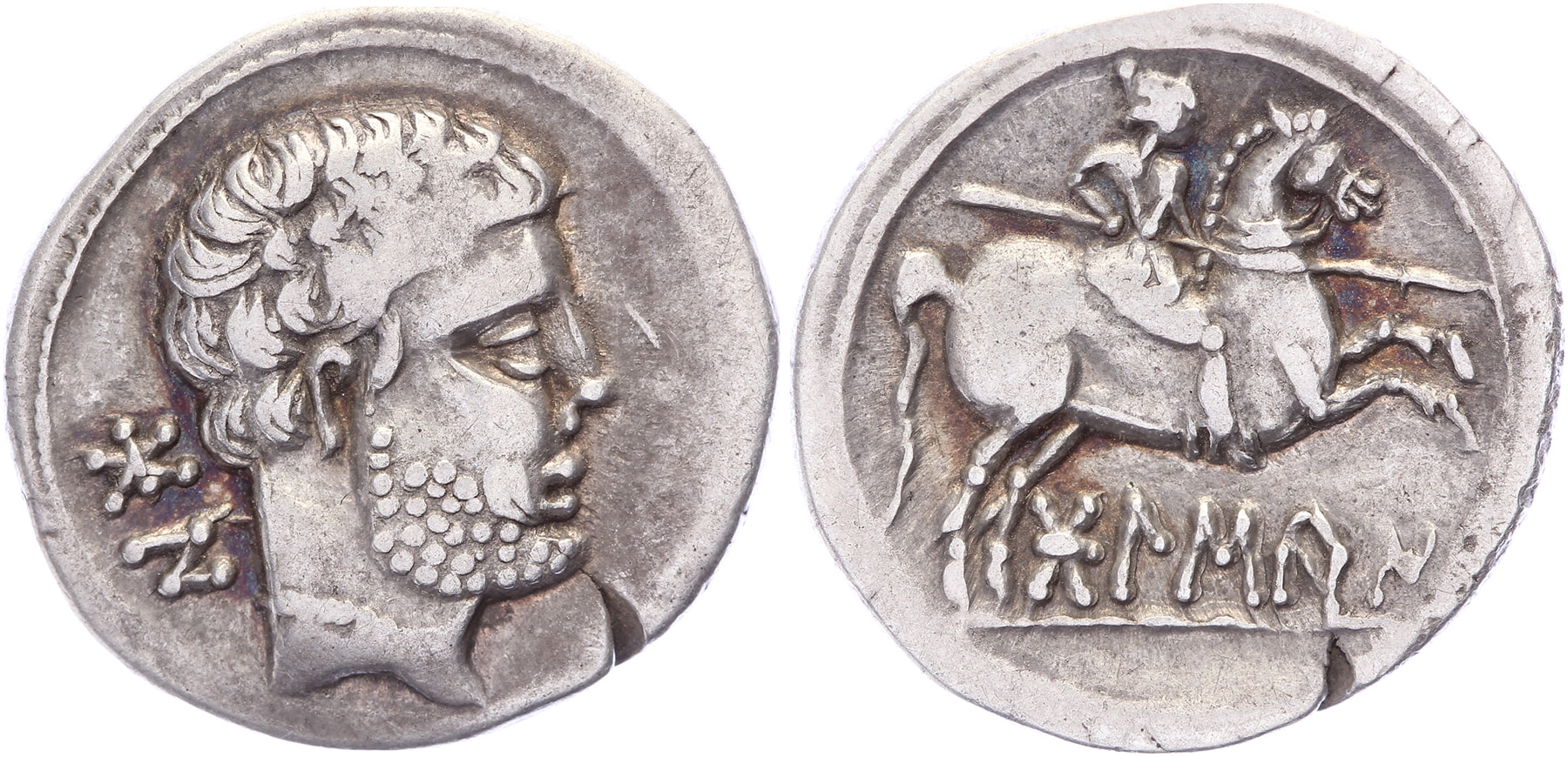 Circa 150-100 BC. AR Denarius [3,62 gm, 19,80 mm]. Bearded head right, Iberian script ‘bon’ to left / Warrior on horseback right, holding spear; Iberian ‘bolśkan’ below. ACIP 1417; SNG BM Spain 710-33. Toned gVF.