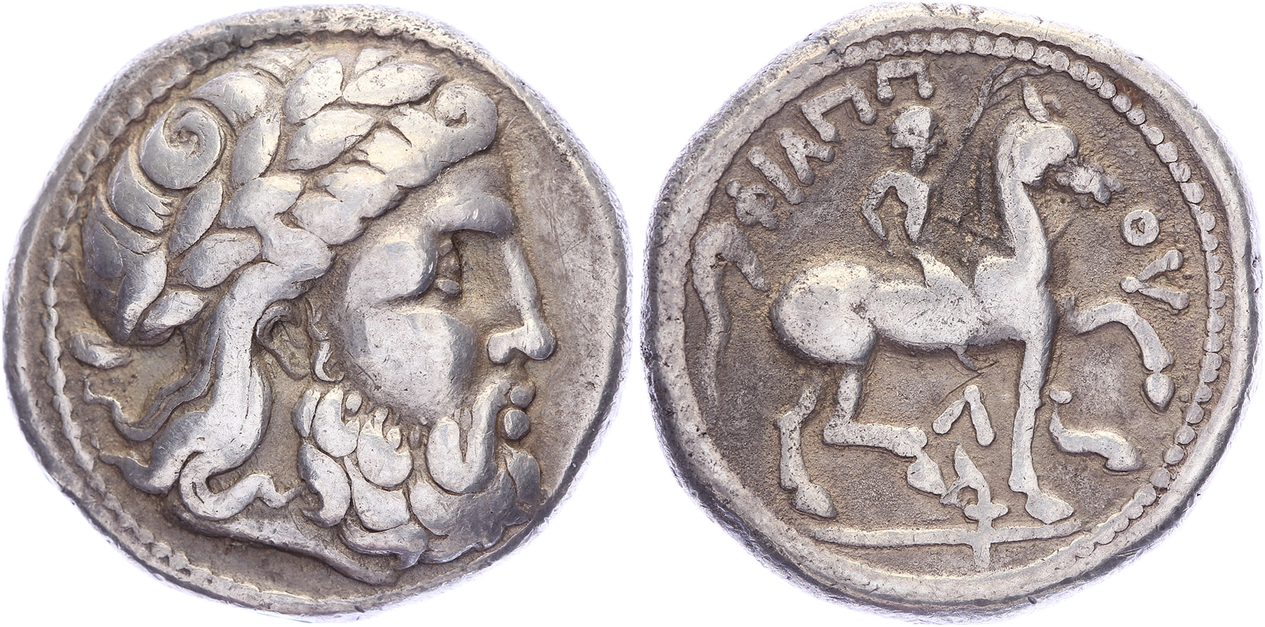 Circa late 4th-3rd century BC. AR Tetradrachm [14,07 gm, 25,50 mm]. Imitating an issue of Philip II of Macedon from Amphipolis. Laureate head of Zeus to right / ΦΙΛΠΠΟΥ, young jockey, holding palm frond in his right hand and reins in his left, riding horse to right; below horse, Λ above torch; below foreleg, dolphin right. Dembski 960 var. (reverse legend); Flesche 642 var. (reverse legend); Lanz 359-60 var. (reverse legend). Göbl OTA 14; Leu Numismatik Web Auc. 20, lot 165 (same dies). VF.