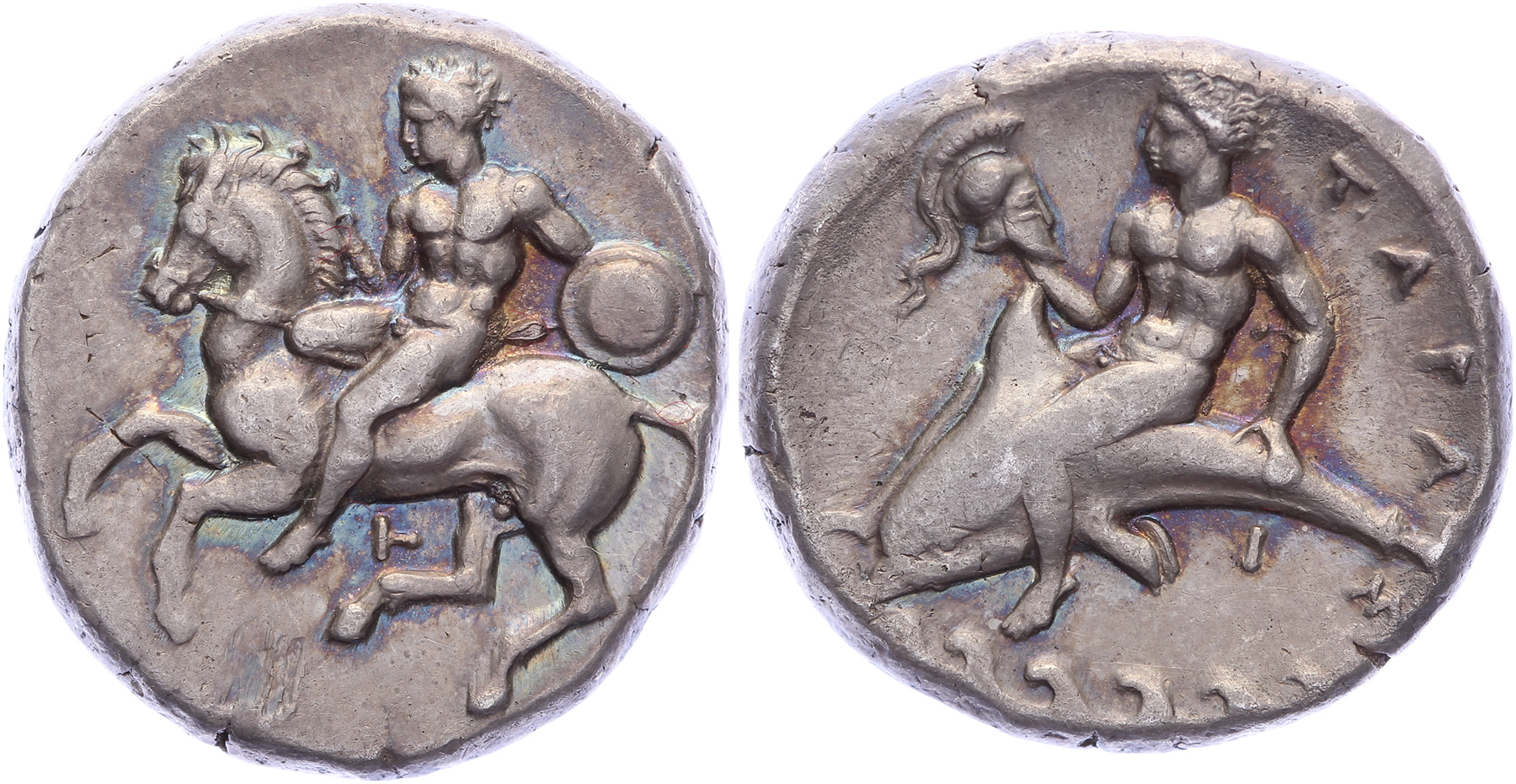 Circa 344-334 BC. AR Nomos [7,78 gm, 20,75 mm]. Naked horseman dismounting left, holding small round shield and lance; T below / TAPA-Σ behind, Taras astride dolphin left, holding crested helmet in right hand, left hand at side; I and waves below. Fischer-Bossert 654 (V252/R506). Fresh dies, toned aEF.