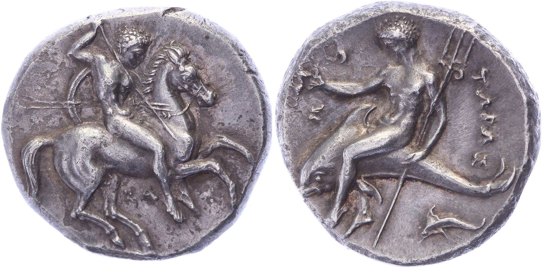 Circa 315-302 BC. AR Nomos [8,32 gm, 21,00 mm]. ΣA Nude rider on horse galloping to right, stabbing with spear held in his right hand and holding two other spears and shield with his left; below, ΣA / TAPAΣ / Ω / Σ Youthful oikist, nude, riding dolphin to left, holding kantharos in his right hand and trident in his left; to lower right, small dolphin left. Fischer-Bossert Group 73, 886 (V347/R688). Toned EF.