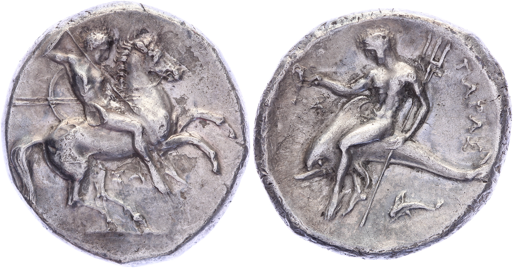 Circa 315-302 BC. AR Nomos [7,67 gm, 20,70 mm]. Sa..., magistrate. Nude rider on horse galloping to right, stabbing with spear held in his right hand and holding two other spears and shield in his left; below, ΣA / ΤΑΡΑΣ Youthful oikist, nude, riding dolphin to left, holding kantharos in his right hand and trident in his left; to left, Ω-Σ; below, small dolphin to left. Fischer-Bossert 883; SNG ANS 1002; Vlasto 614. Smal areas of porosity, toned gVF.