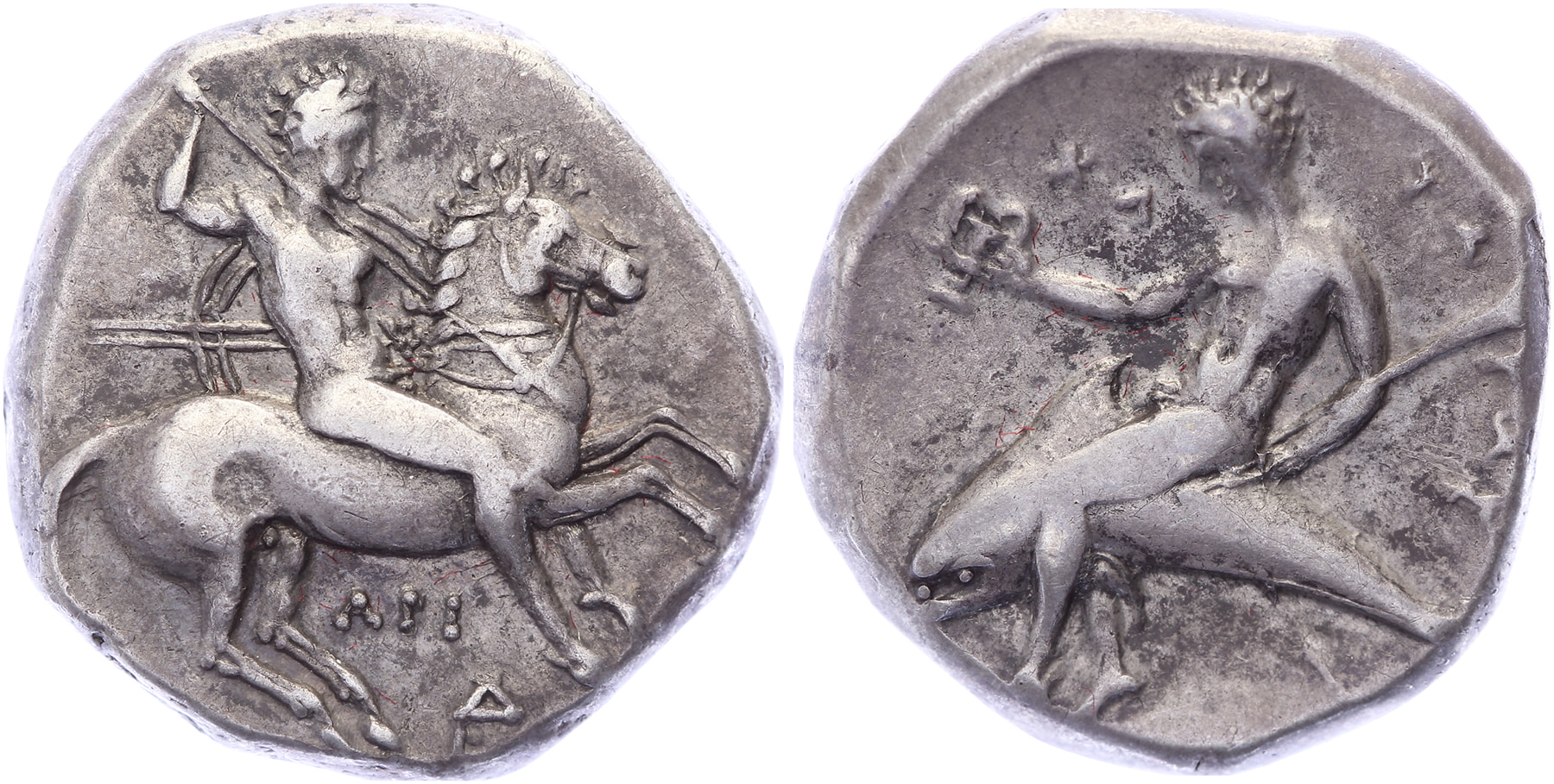 Circa 315-302 BC. AR Nomos [7,93 gm, 20,00 mm]. Ari-, X-, and Kl-, magistrates. Nude warrior, on horseback right, wearing helmet, holding shield and two spears, and thrusting third spear downward; API below, X to right / Phalanthos riding dolphin left, holding kantharos and rudder; KΛ to left. Fischer-Bossert group 74a, 936 (V363/R725). Toned gVF.