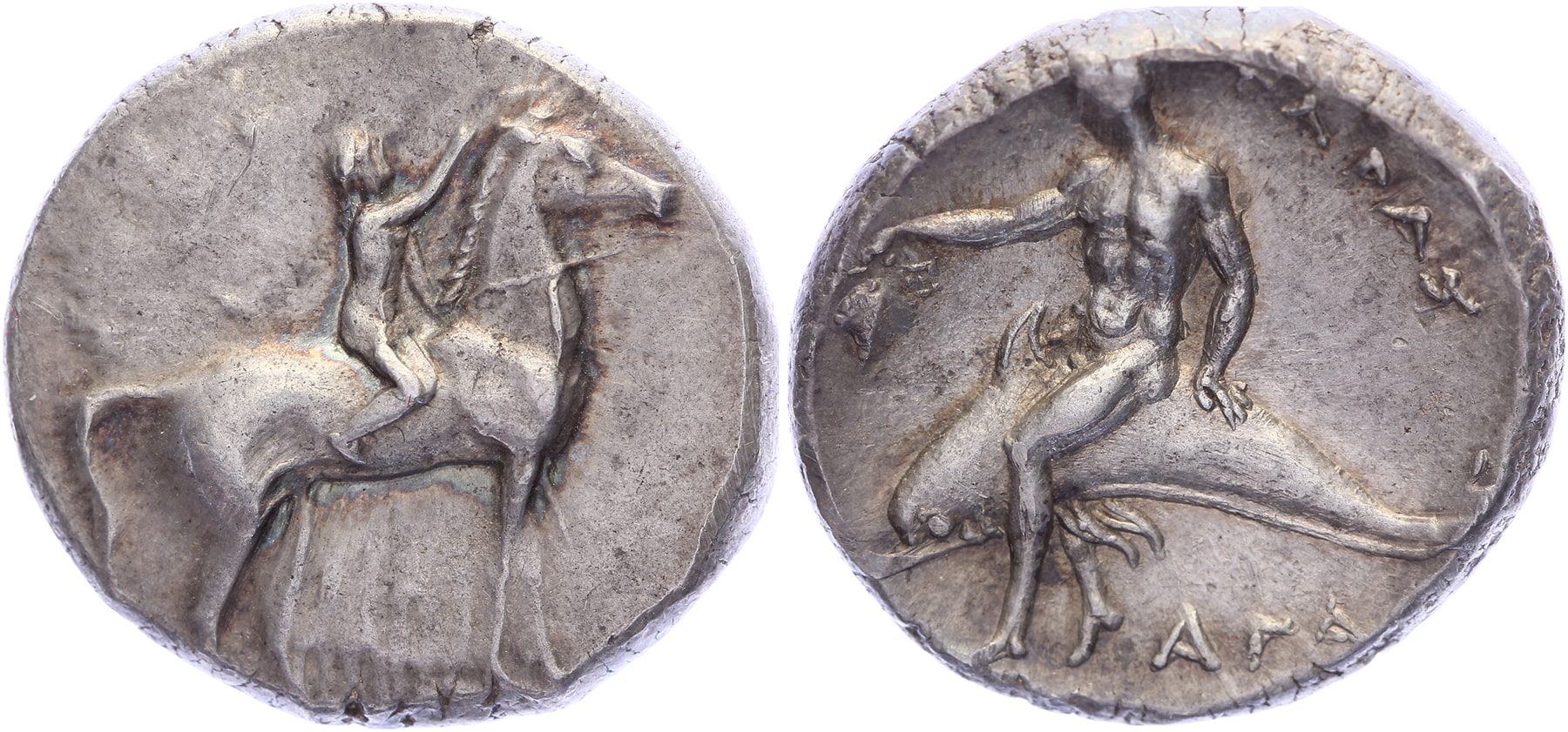 Circa 302-280 BC. AR Nomos [7,87 gm, 22,15 mm]. Nude youth riding horse walking to right, raising his right hand to crown the horse’s head; to left, ΣΑ; below, ΦΙΛΙ/APXOΣ / TAPAΣ, youthful oikist, nude, riding dolphin to left, holding grape in his right hand and resting his left on the dolphin; below, ΑΓΑ. Vlasto 673. Struck from a somewhat worn obverse die, nicely toned EF.