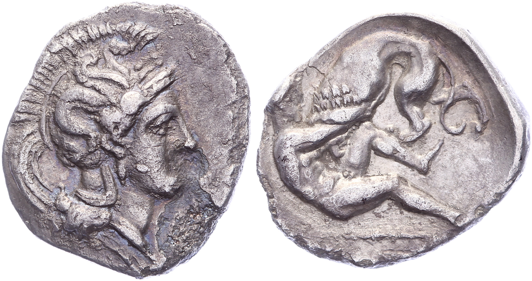 Circa 302-228 BC. AR Diobol [1,07 gm, 13,60 mm]. Head of Athena right, wearing crested Attic helmet / Herakles wrestling the Nemean lion; club behind, [TAPANTINΩN]. Vlasto 1383. Roughness VF.