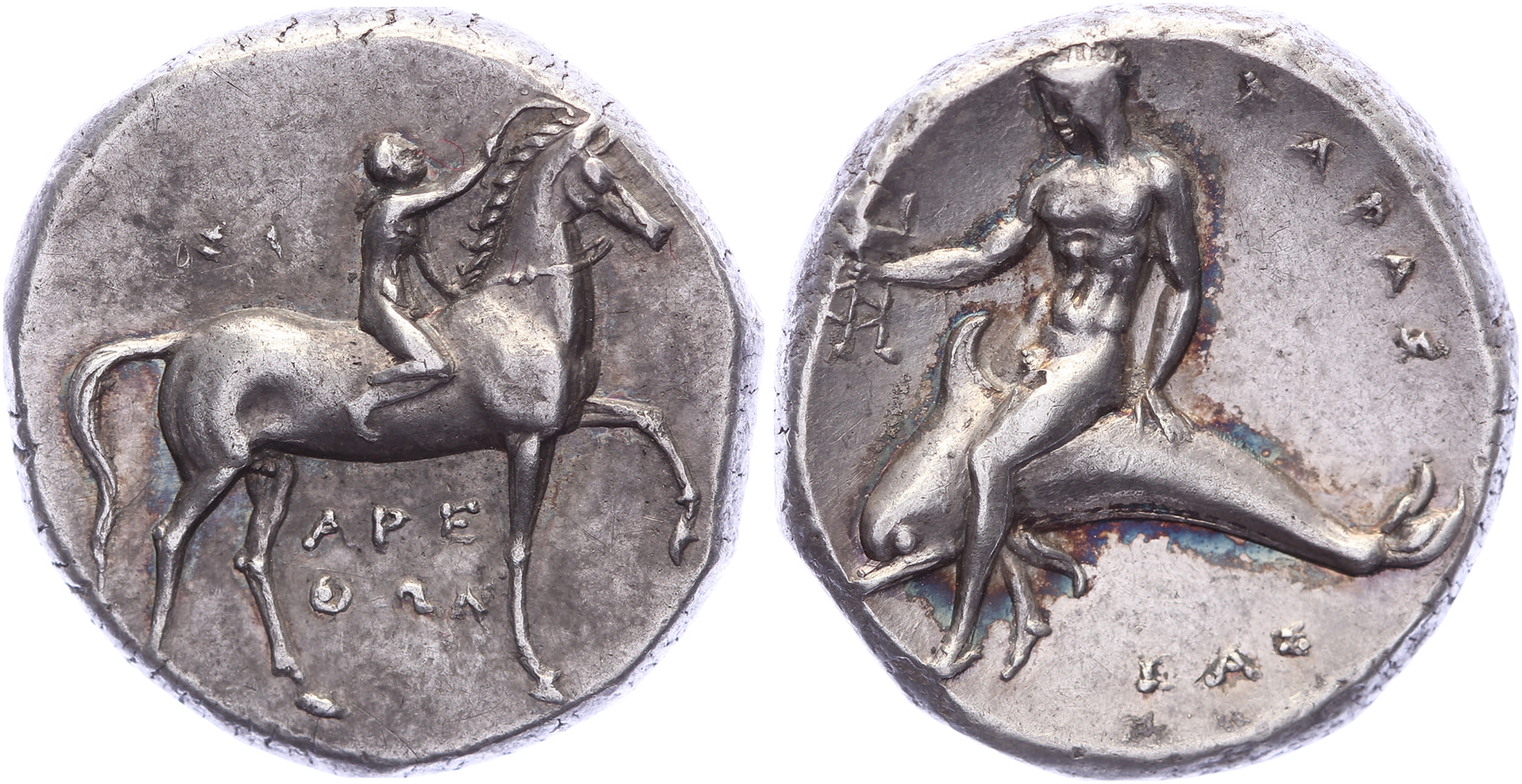 Circa 280 BC. AR Nomos [7,91 gm, 21,10 mm]. Youth on horseback right, crowning horse; ΣA to left, APE/ΘΩN in two lines below / ΤΑΡΑΣ, Phalanthos, holding tripod, riding dolphin left; CAΣ below. Vlasto 666-7. Toned EF.