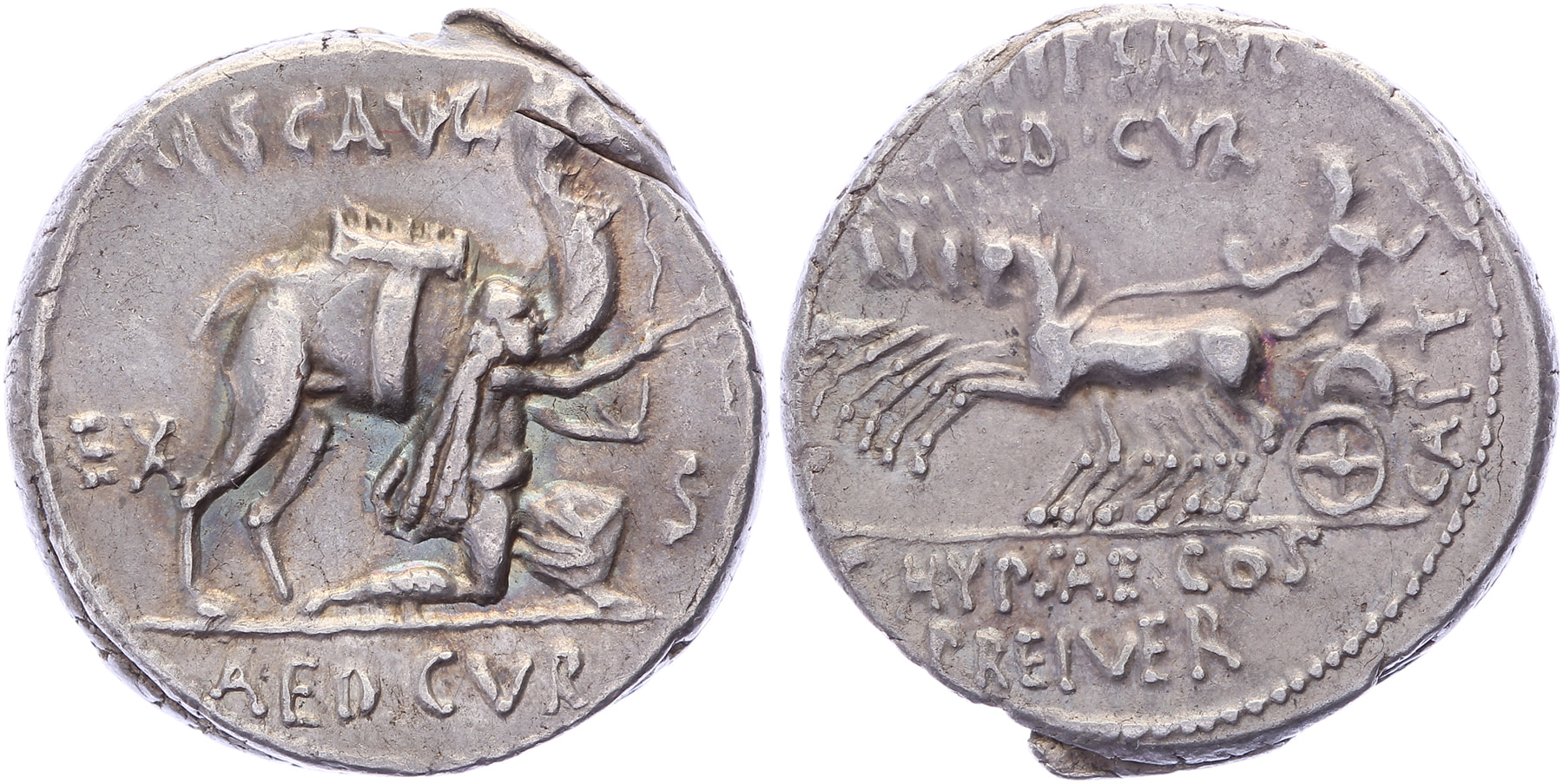 AR Denarius [4,09 gm, 17,70 mm]. M·SCAVR / AED CVR, kneeling figure right, holding olive branch and reins of camel standing beside him; on either side, EX - S·C / [P·H]VPSAEVS / AED CVR Jupiter in quadriga left holding reins in left hand and hurling thunderbolt with right; behind, CAPTVM; C HVPSAE COS / PREIVE in exergue. Babelon Aemilia 8 and Plautia 8. Sydenham 912; Crawford 422/1a. Toned gVF.
