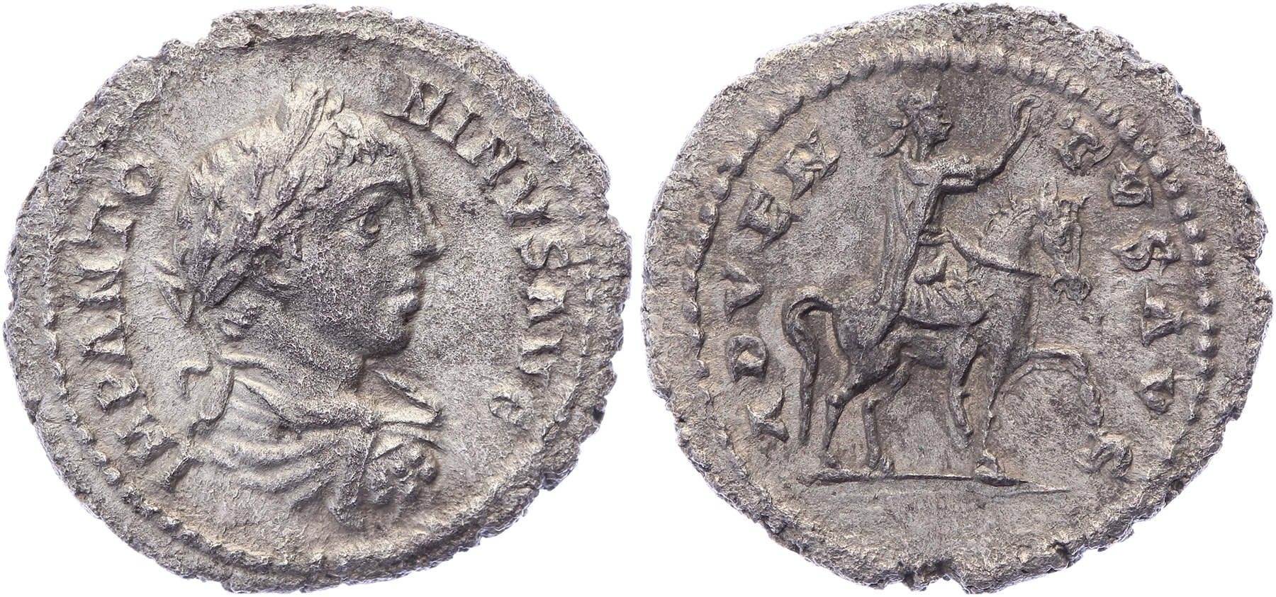 AR Denarius [2,83 gm, 20,70 mm]. Uncertain eastern mint. Struck 219/20 AD. IMP ANTO NINVS AVG, laureate, draped, and cuirassed bust right / ADVENTVS AVG,emperor on horseback right, holding reins and raising hand. RIC 184 var. (bust type); Thirion 340; BMCRE 309 var. (same); RSC 2 var. (same). Very rare. Some porosity and roughness, toned VF.